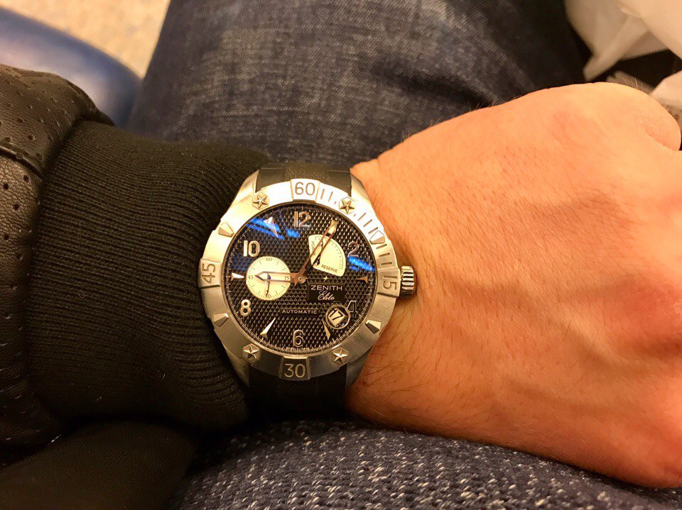 Ритейл часов составляет 7200$, и это чувствуется в каждой детали! Гильошированный циферблат с ручным декорированием, фирменные звезды на стальном вращающемся безеле, вынесенная секундная стрелка на малом циферблате, индикатор резерва запаса хода, играющий не только полезную функциональную роль, но и отлично дополняющий и без того шикарный внешний дизайн модели. Под "капотом" имеем мануфактурный механизм El Primero Zenith 4021 с запасом хода 55 часов, состоящий из 179 деталей, чью красоту имеем удовольствие наблюдать через прозрачную заднюю крышку. В общем - шик одним словом, часы реально ловят взгляды прохожих. Да и вообще, с таким атрибутом на руке Вы сразу обозначаете окружающим "who is who"
