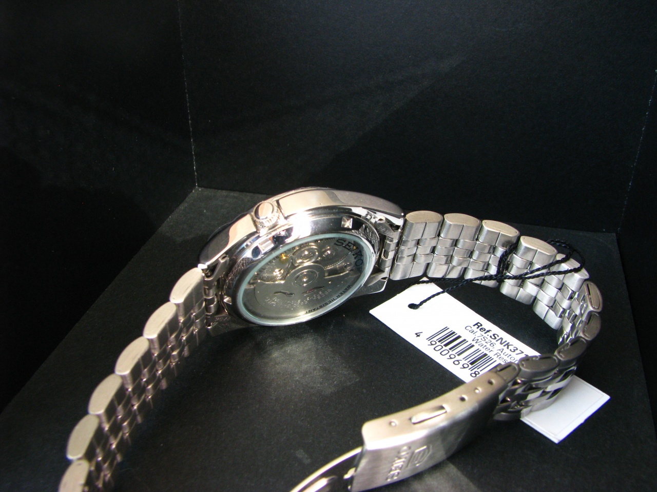 Корпус часов Seiko 5 SNK809, выполненный из нержавеющей стали имеет хорошую обработку поверхности и является довольно прочным. Пространство между корпусом часов и стеклом герметично и надёжно. Задняя крышка часов выполнена прозрачной.