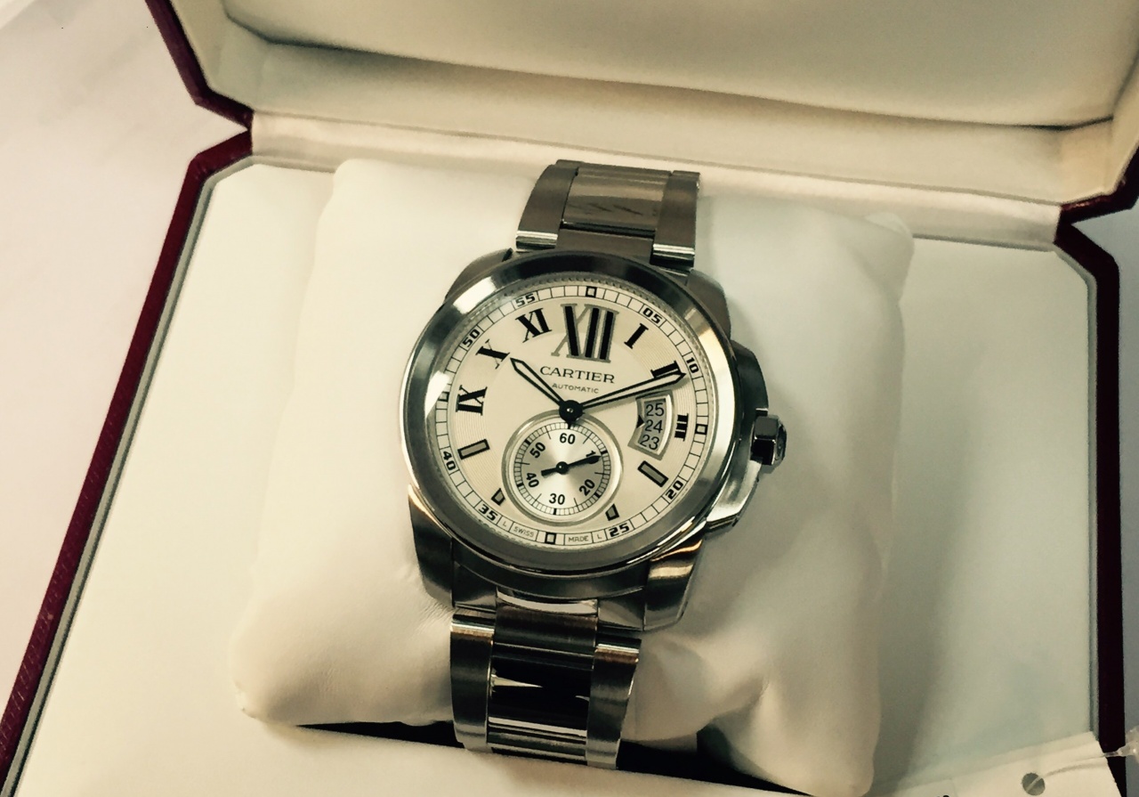 Очередная модель из коллекции Сalibre de Cartier от известного во всем мире производителя часов Cartier. Корпус этих часов довольно мощный,выполнен в круглой форме из нержавеющей стали. Основные функции: часы,минуты,секунды и дата. Индикатор даты находится на позиции 3х часов. Римские цифры, в сочетании с отлитыми вручную из вороненой стали люминесцентными черными стрелками, великолепно смотрятся на серебристом циферблате. Сапфировые стекла безеля и задней крышки защищают от царапин и прочих повреждений. Автоматический мех-м оснащен собственным мануфактурным калибром 1904-PS MS с запасом хода 48часов. Заводная головка украшена синей шпинелью.
