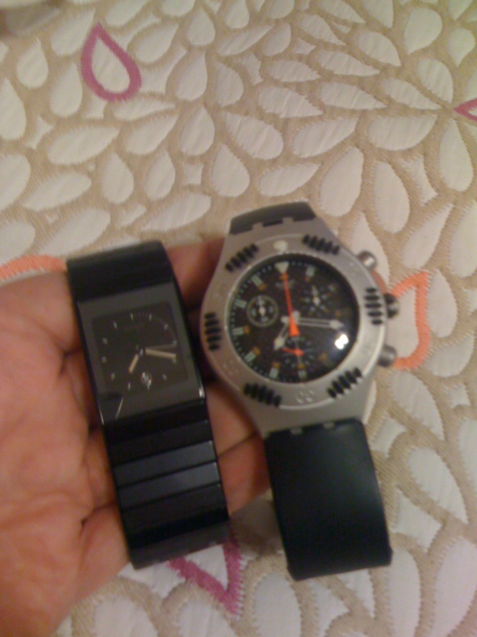 приветствую коллеги! Итак Своч. НО, своч раритетный, покупал его (дай Бог памяти) лет 10 назад, хронограф, алюминиевый корпус, каучук, водонепроницаемость 200 метров. Точность хода спецом не проверял, но как выставил по своей более дорогой свиссии, так себе и идут спокойно. Не бегут, не отстают. Часы полностью обслужены, за 10 лет встали 1 раз, по причине севшей батарейки, батарейка заменена около полугода назад в галерее Актер,тогда же были проверены все прокладки и прочее, что можно было проверить, тикают дальше. теперь самое приятное- часы в состоянии новых ввиду того, что практически все время лежали на полке. Коцок и царапин нет в принципе, каучук в идеале, риски светятся, безель крутится, в общем одел и пошел, а может даже и поплыл. А может и нырнул. По заверениям парней из магазина Своч- это одна из последних толковых моделей. Теперь о цене. Поскольку часы лежат, а должны жить на руке, отдам в хорошие, заботливые руки тому, кто в свою очередь отдаст в мои заботливые руки 200 долларов северо-американских соединенных штатов.