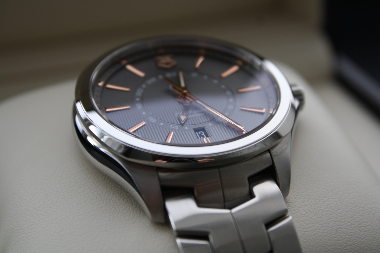 Классическая мужская модель, отображение второго часового пояса отдельной стрелкой в 24-часовом формате в центре циферблата, окошко даты в положении 6 часов, завинчивающаяся заводная коронка, прозрачная задняя крышка из сапфирового стекла