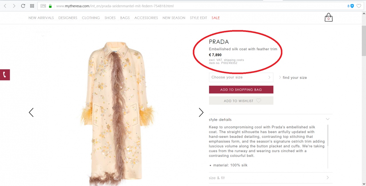 Стоимость аналогичных пальто в бутике PRADA от 270 000 до 520 000 руб.