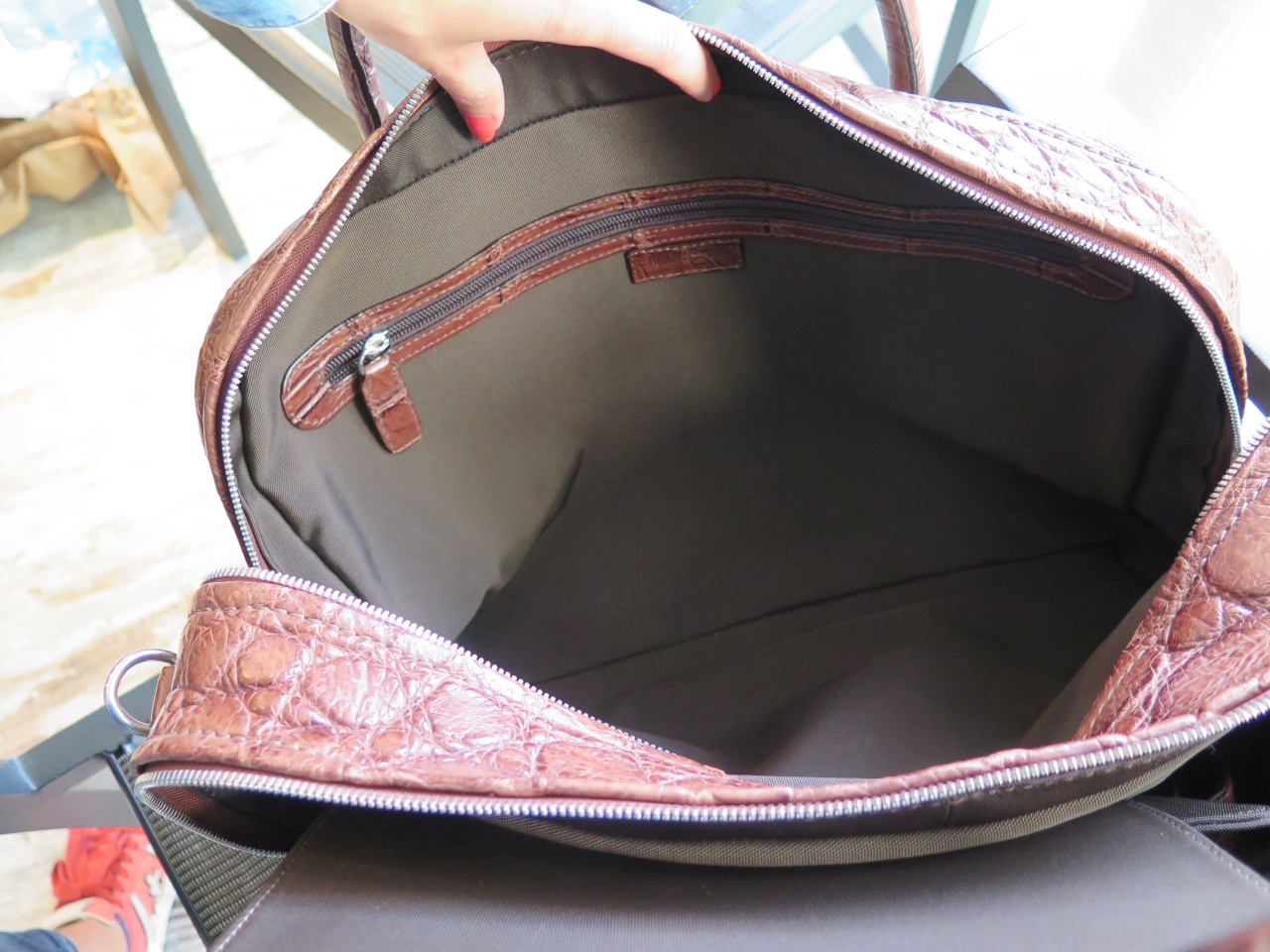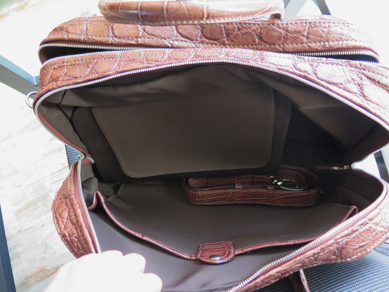 Внутренняя часть сумки изготовлена из 100% плотной износостойкой ткани темно-коричневого цвет и имеет два больших отделения для ноутбуков или планшетных компьютеров типа iPad, в отделения можно дополнительно поместить большое количество документов и другие вещи. Второй отсек аналогичен первому по объёму, и имеет два кармана под документы и отделение на молнии с бегунком из кожи крокодила.