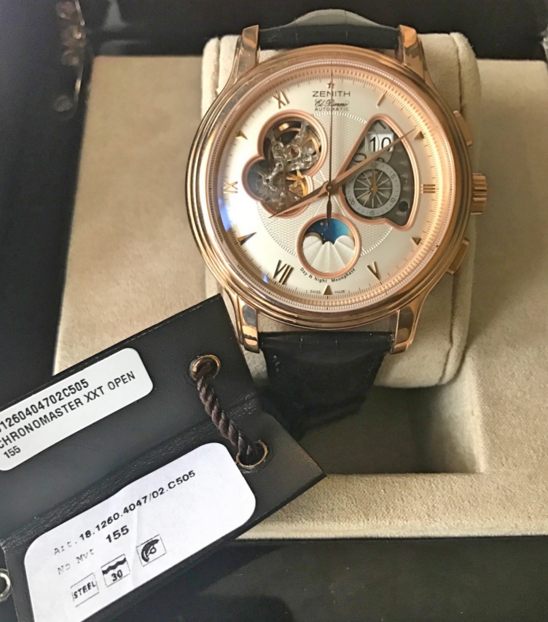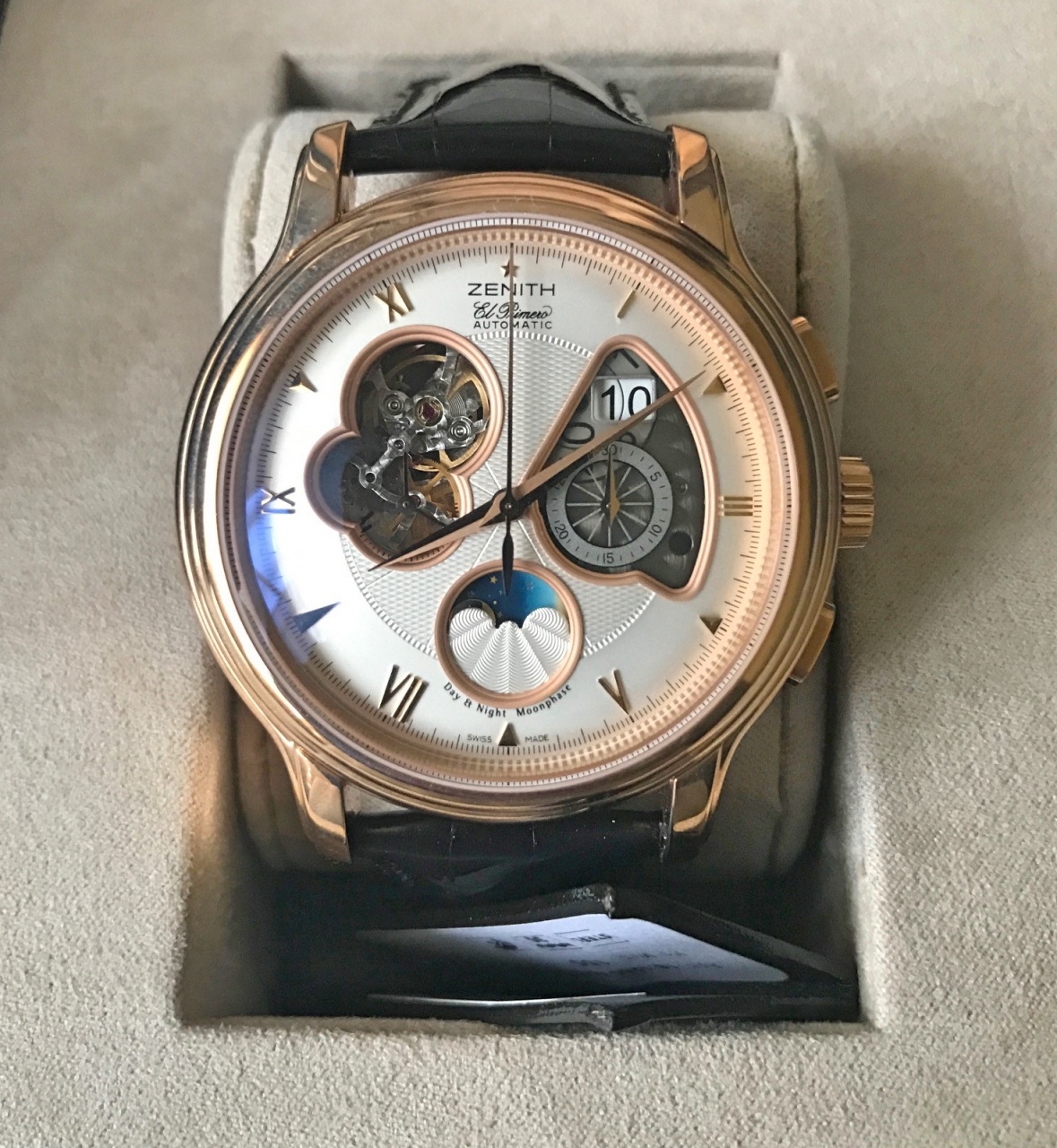 Данное уникальное техническое усложнение коллекции Grande Date, которое еще раз иллюстрирует возможности специалистов компании, хронограф Moon & Sunphase представляет новый механизм El Primero 4047, который состоит из 332 деталей и 41 рубина и может быть увиден через отверстие в циферблате. Гильошировка Grain d’Orge на циферблате, волнистая гильошировка на счетчиках и лунном диске, перламутровая пластина и гильошированная двигающаяся вперед и назад гиря представляют собой четкие и недвусмысленные свидетельства аутентичности технологий, использованных при изготовлении часового механизма.
