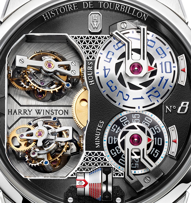 Говоря о Harry Winston Histoire de Tourbillon 8, двойном двухосном турбийоне, стоит обратить внимание на то, что вместо традиционного двухстрелочного отображения времени на циферблате появилась пара вращающихся дисков - часы в позиции 1:00 и минуты в позиции 4:00. В левой части циферблата можно наблюдать вращение двух турбийонов. Ось вращения обеих турбийонов имеет наклон 30 градусов. Вторая клеть турбийона совершает полное вращение за 45 секунд. Балансовая частота механизма составляет 21 600 пк/час. Запас хода – 55 часов, что отображается на конусе-индикаторе на 6-ти часах.