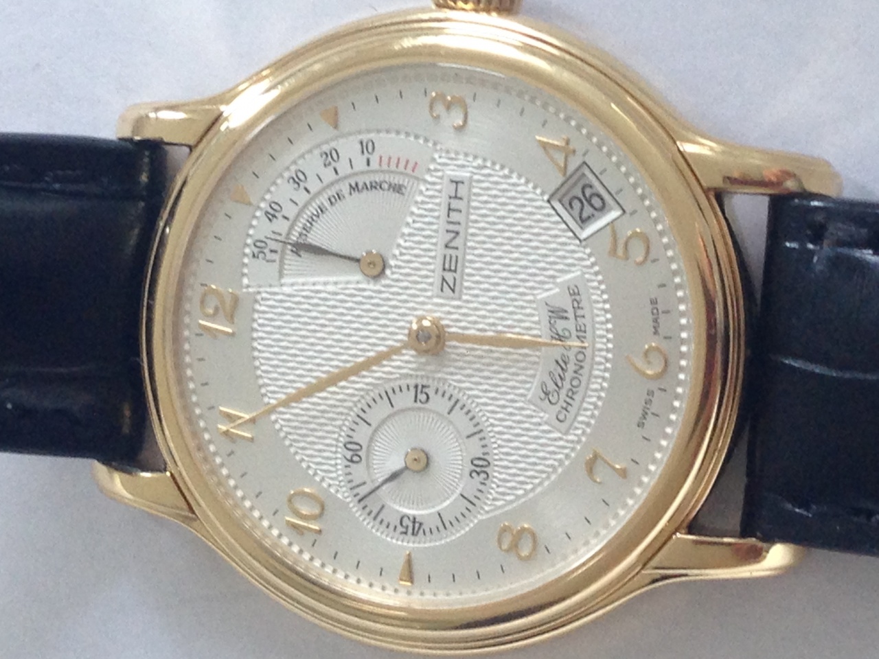 Часы швейцарские фирмы Zenith , золотые 18K, розовое золото, механические. Носили мало. Механизм чистили, была полировка. Стандартные для модели Elite 2000 года опции: секундная стрелка в отдельном круге, резерв завода в отдельном секторе, дата. В наличии оригинальная коробка, сертификат, документы. Нет видимых заметных следов использования. Оценка состояния как А (хорошее) дана исключительно из-за отсутствия родного ремешка. Ремешок кожаный, черный, абсолютно новый, производства Германия.