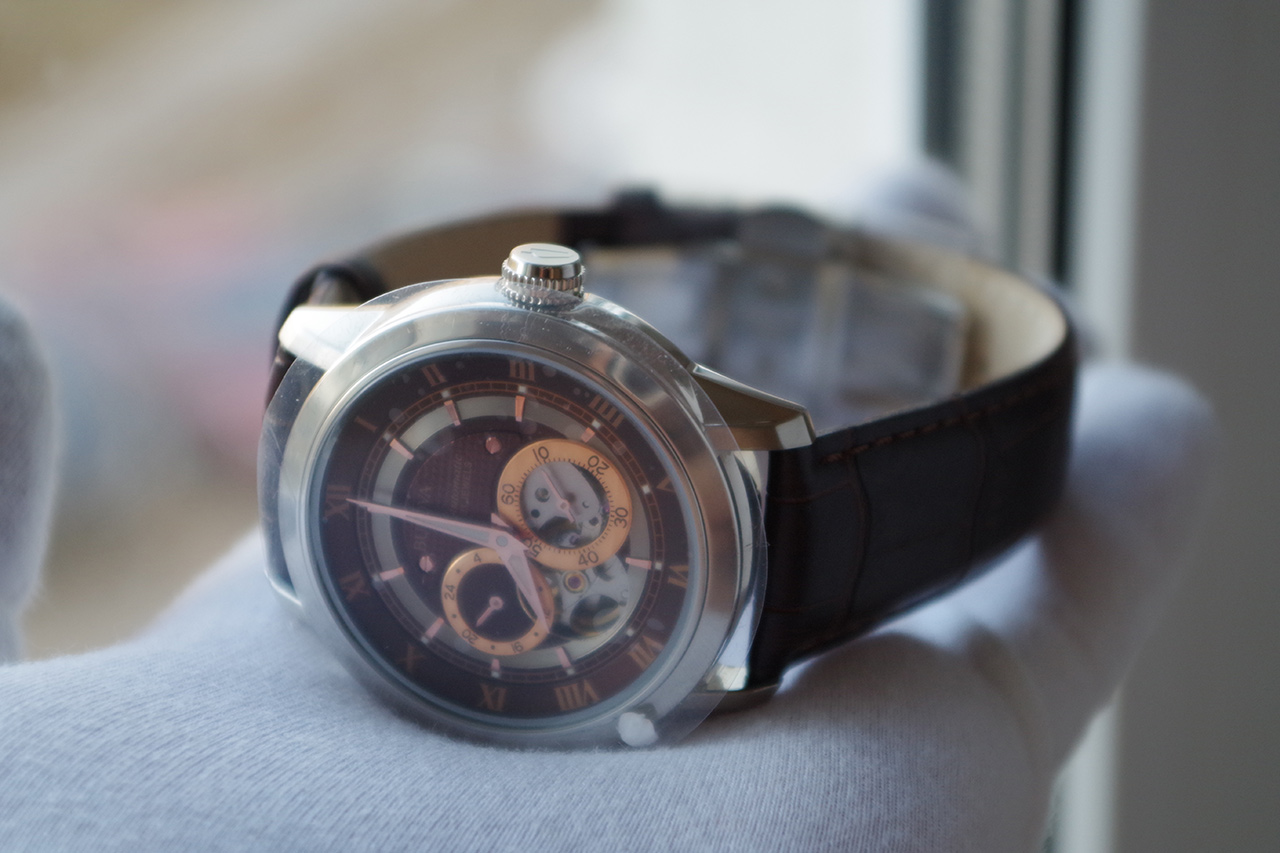 Mechanical. Сквозь прозрачное окошко на циферблате можно наблюдать за работой механизма часов. В механизме 21 камень. 12-ти и 24-х часовой формат времени. Секундная стрелка вынесена на отдельный циферблат. Прозрачная задняя крышка.