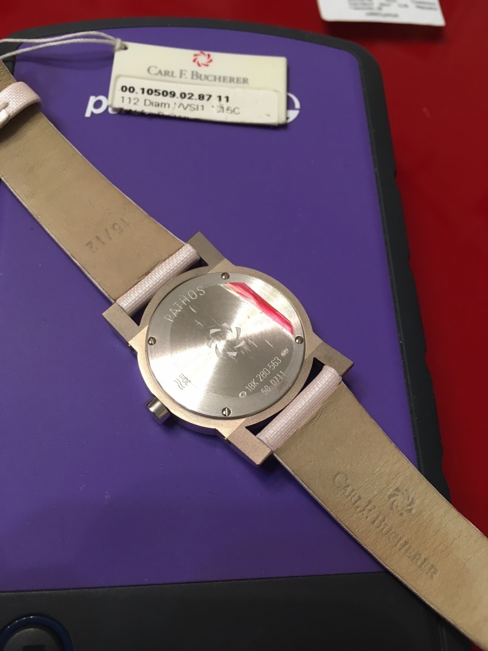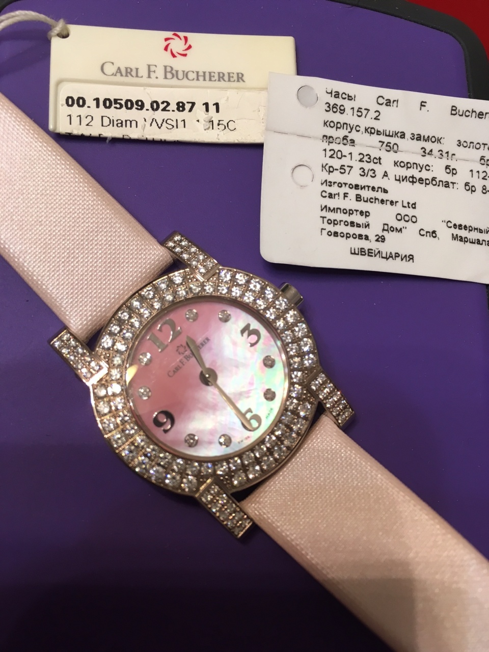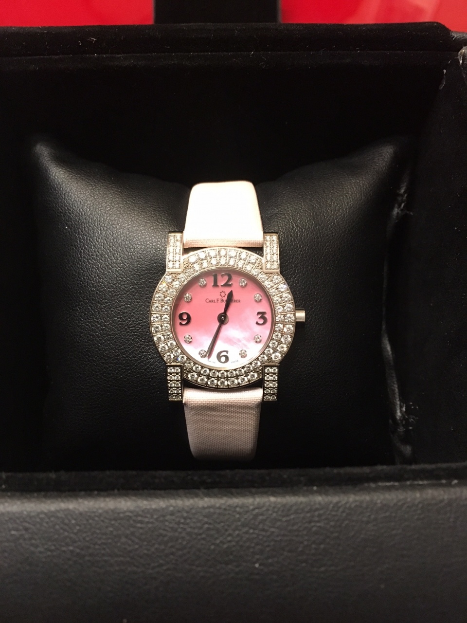 18 carat white gold case with a pink satin bracelet. Fixed bezel. Pink mother of pearl dial with silver-tone hands and diamond-Arabic numerals hour markers. Dial Type: Analog. Quartz movement. Scratch resistant sapphire crystal. Pull / push crown. Case size: 32 mm. Round case shape. Water resistant at 30 meters / 100 feet. Functions: hour, minute. Luxury watch style. Watch label: Swiss Made. Item Variations: 369.157.2. Carl F. Bucherer Pathos Midi Ladies Watch 00.10509.02.87.11.