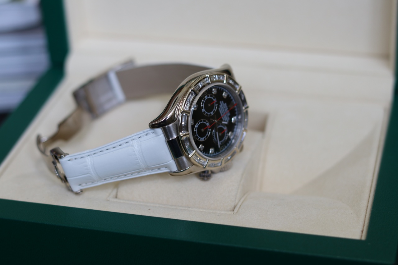 Прекрасная Daytona! Камни установлены после покупки! Все сделано правильно и аккуратно! После полировки и новый оригинальный ремень из крокодила!