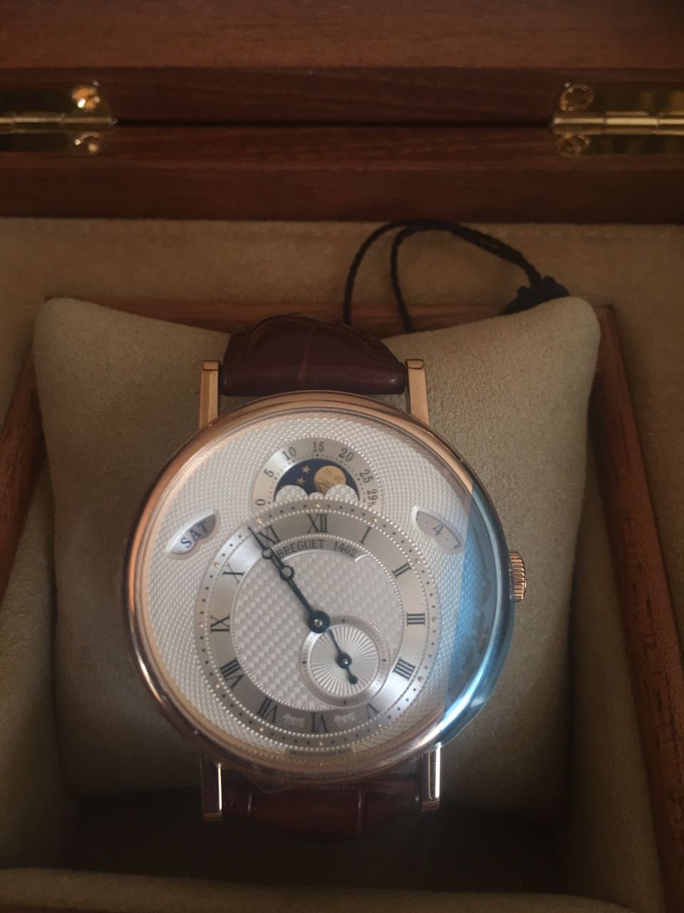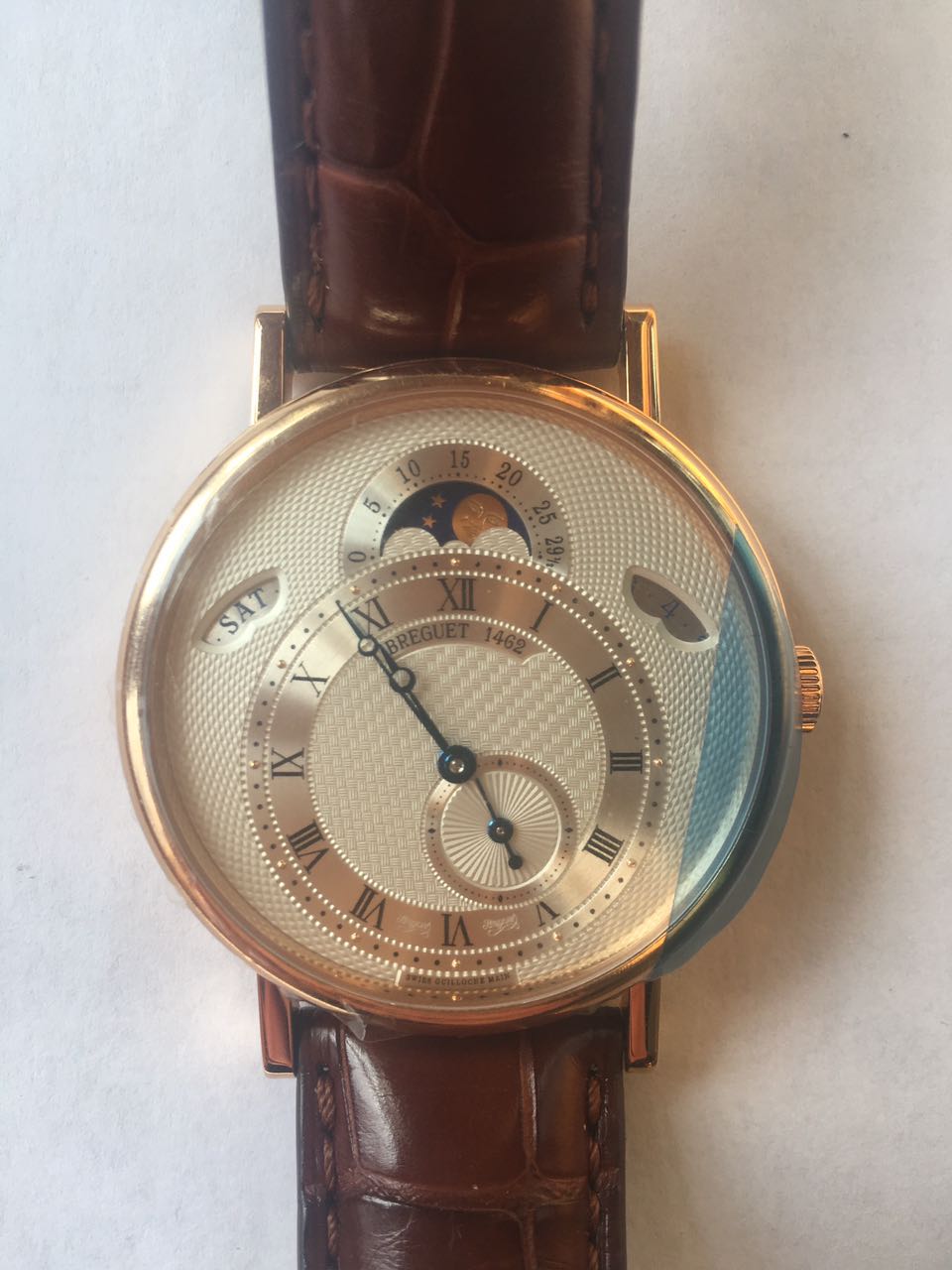 Часы Classique в корпусе из 18-каратного розового золота укомплектованы автоматическим механизмом с запасом хода 45 часов. Циферблат из посеребренного 18-каратного золота с гильошированным вручную узором. Смещенная шкала с римскими цифрами в положении "6 часов", гильошированный узор "плетеная корзинка". Указатель фаз луны и лунного цикла в положении "12 часов". Указатель даты в положении "2 часа". Указатель дня недели в положении "10 часов". Секундная стрелка в положении "5 часов". Ротор из 18-каратного золота с гильошированным вручную узором. Задняя крышка из сапфирового стекла. Водонепроницаемость корпуса составляет 30 метров. Часы поставляются на коричневом ремешке из кожи аллигатора с застежкой из розового золота 18к.