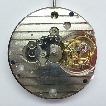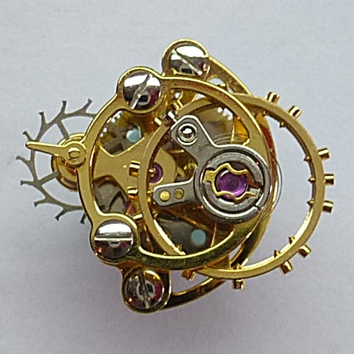 Второе колесо здесь не колесо и заклепки диска, так же, как обычное второго колесо. Вместо этого, колесо и привод второго колеса разделены! Двигатель приводится в движение третьего колеса и несет на своей оси, каретке турбийона. Таким образом, эта рамка вращается вместе с осью второго диска один раз каждой минутой. Она несет в себе блок балансира, якорь и якорное колесо, которое, следовательно, постоянно вращать его.
