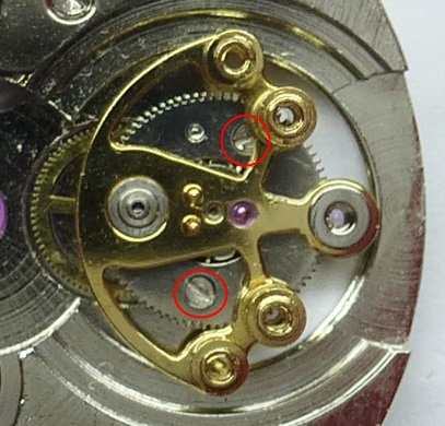 После удаления якоря и якорного колеса, вы смотрите два винт серебряного колеса (красный). Это второе колесо и привинчивается к пластине движения, поэтому он не может превратить себя! Золотистый является кареткой турбийона.