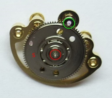Красный кружок обозначает второй диск, красный S секунды. Между ними есть шариковый подшипник. Вопрос в том, как сила, таким образом, передается от второго колеса на ходовом колесе и спуске. До сих пор, ось второго колеса вращается так, только турбийонный кадр.