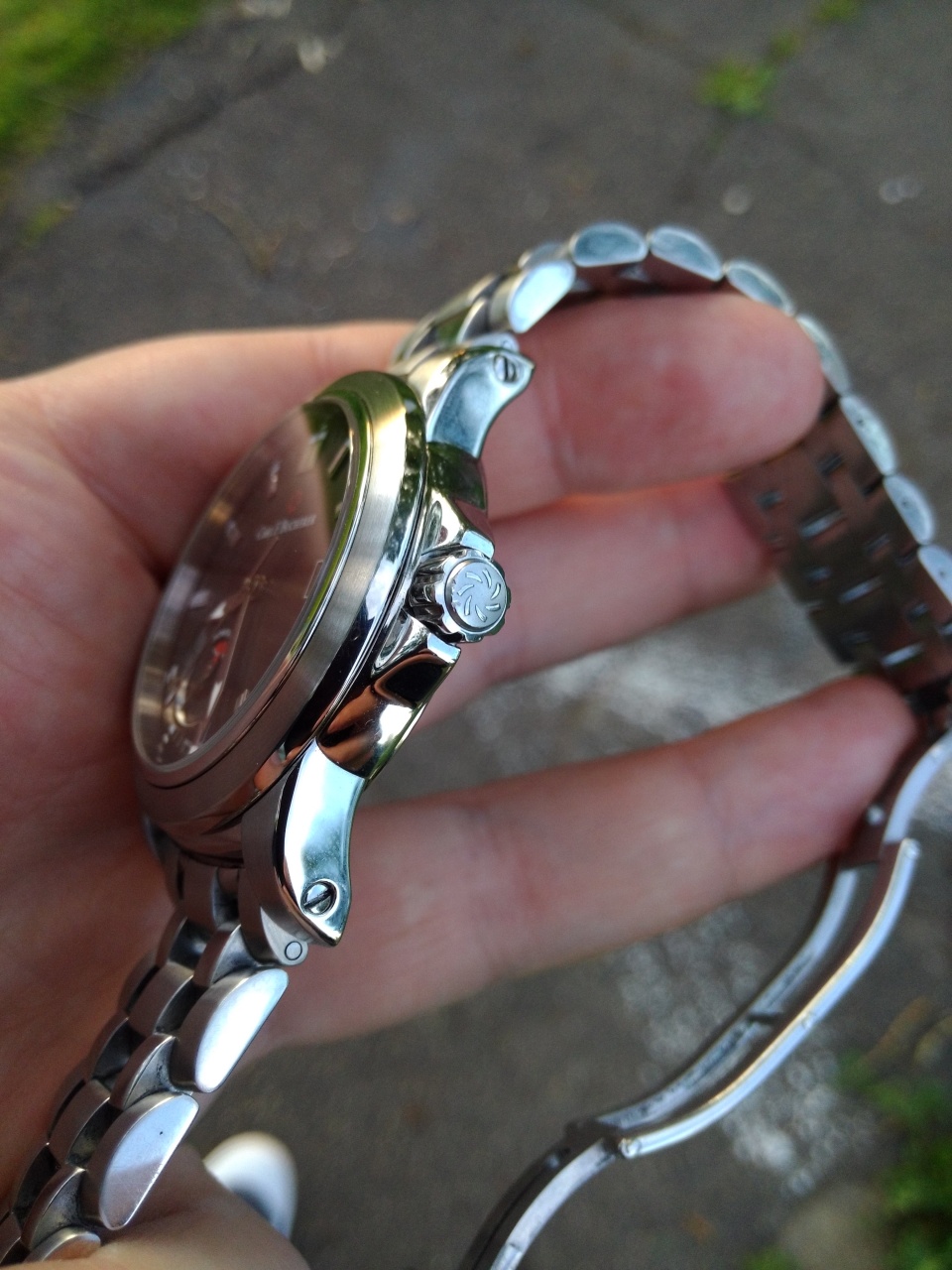 Функции: дата, резерв хода, завинчивающаяся заводная головка, люминесцентная подсветка стрелок.