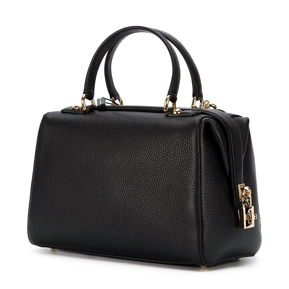 "Черная кожаная сумка с висячим замком от Доменико Дольче и Стефано Габбана вошла в коллекцию 2016-2017 года. Стильная и функциональная сумка с двумя ручками и съемным плечевым ремнем сшита из великолепной зернистой кожи, с подкладкой из ткани в горох."
