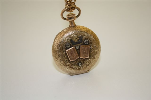 Возможно производитель кейса или сборщик часов "зашифрован" в "ветке" (или аббревиатуре типа YU). Позже часы "тюнингованы" в ювелирной мастерской алмазами и накладными шильдиками из "червоного золота" с инициалами выполненными готическим шрифтом.
