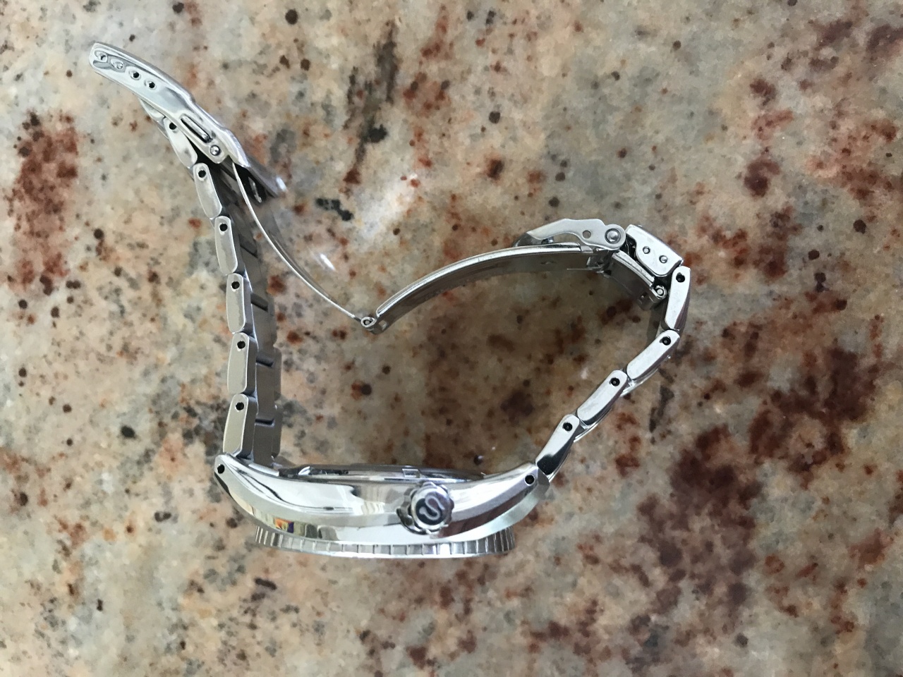 Стальной браслет, застежка с кнопками раскрытия и защитной скобой