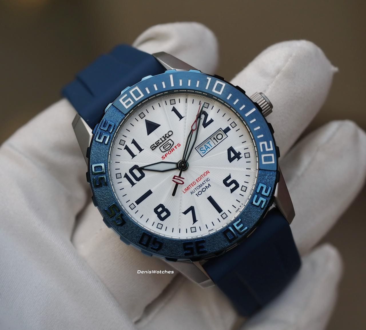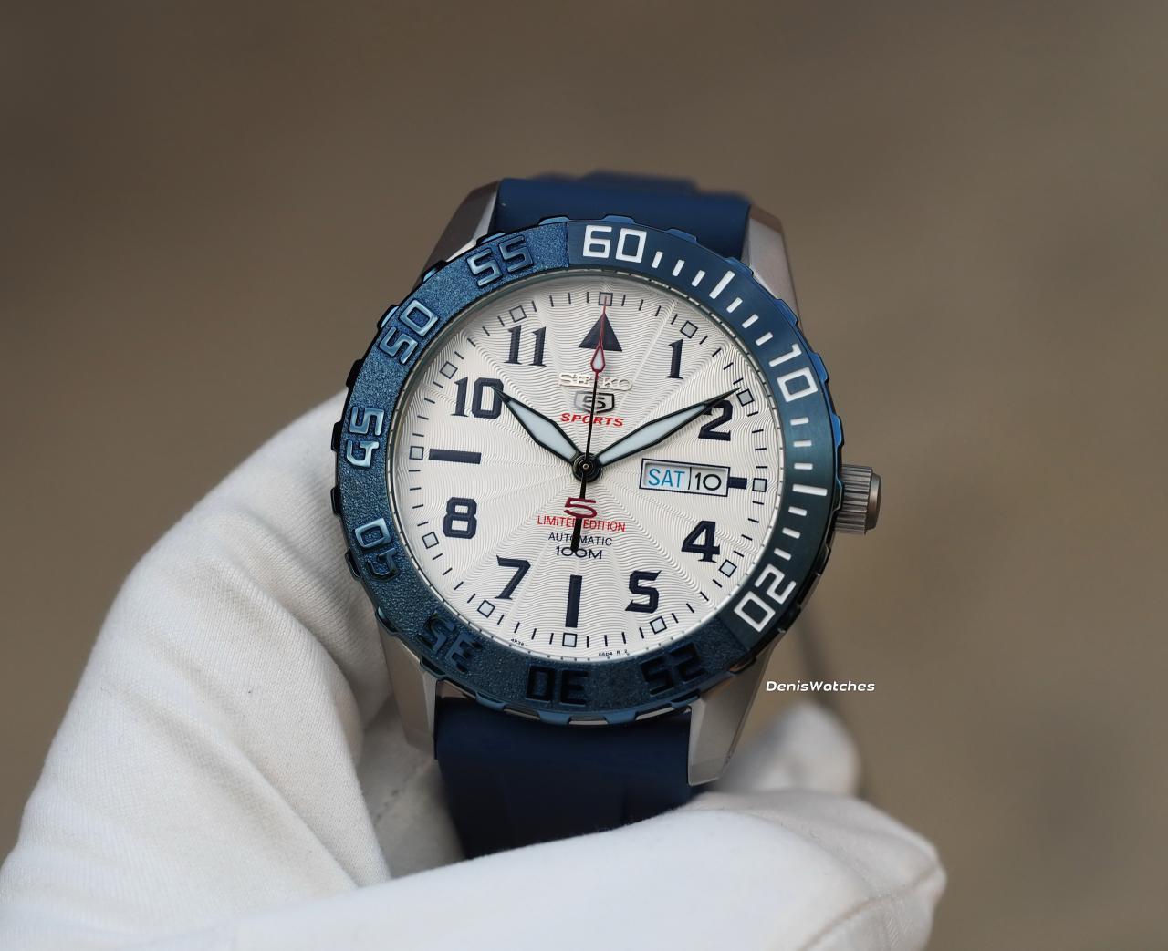 Светлый циферблат с гильёшированием, накладные лого Seiko и 5