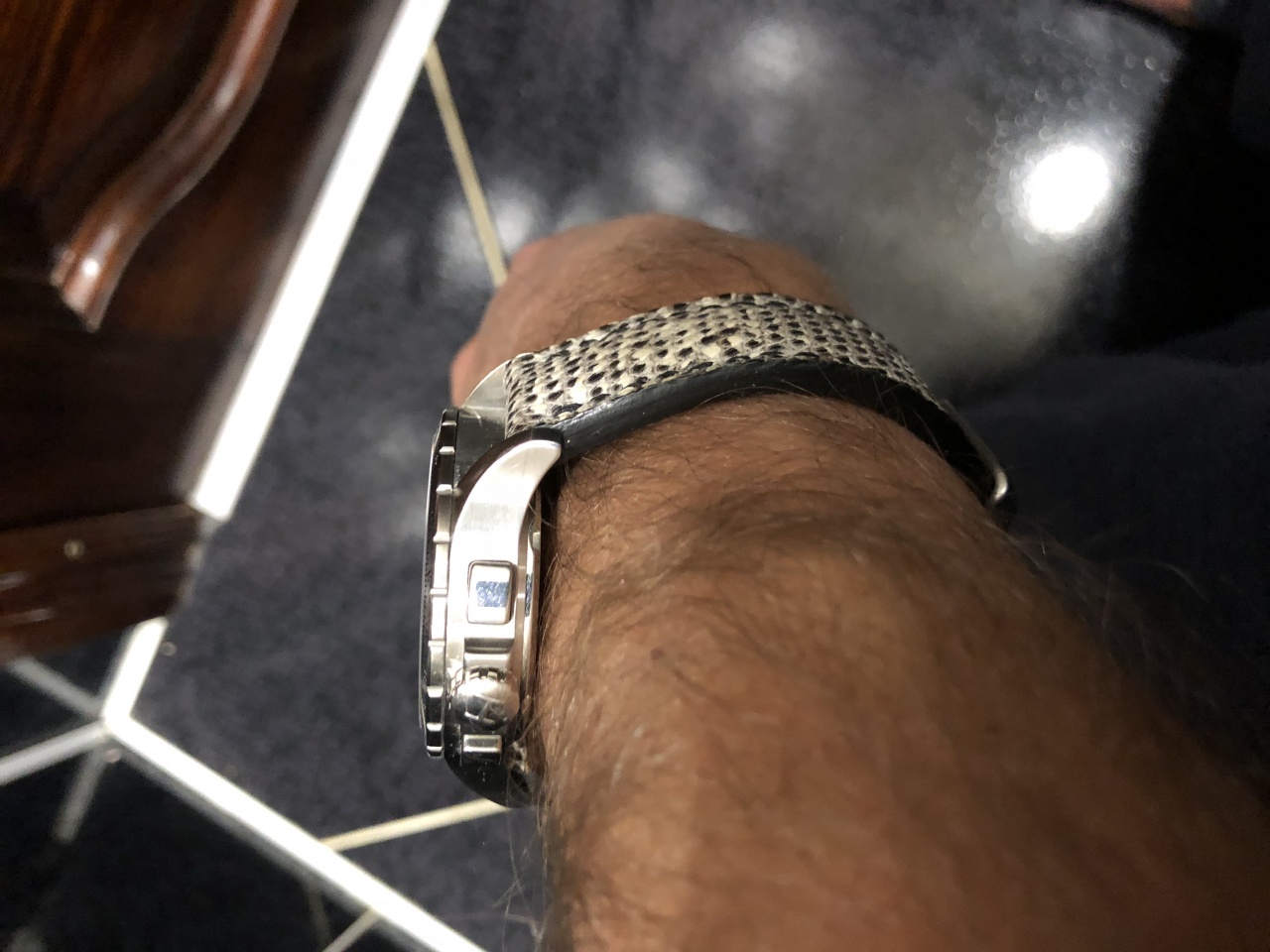 сложная модель с авиационными функциями расчета. Хронограф, логарифмическая линейка, вращающаяся шкала. Индикация даты в положении 6 часов.