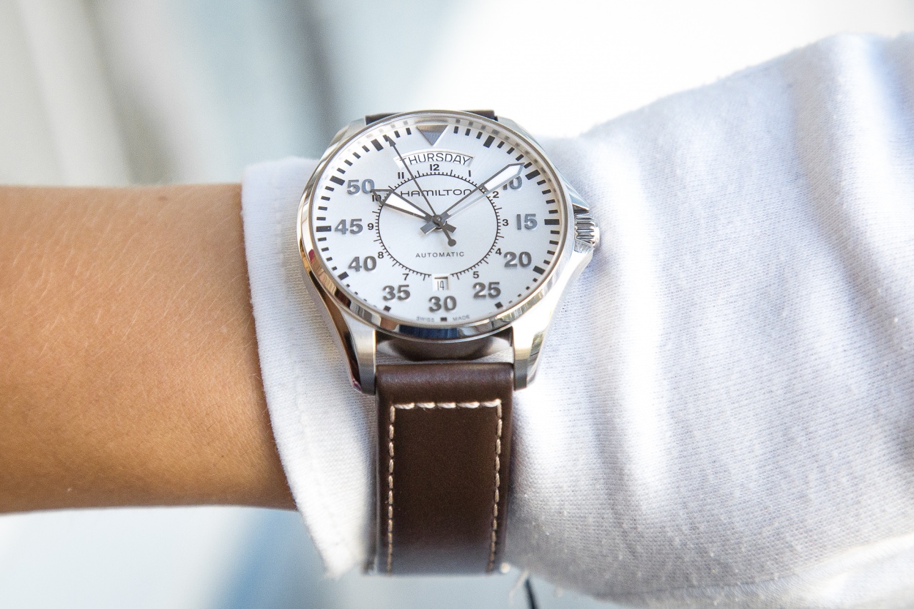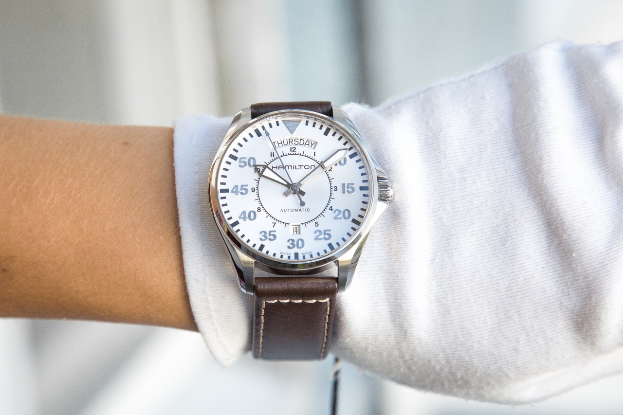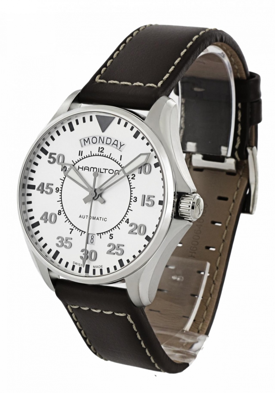 Khaki Pilot с их классическим дизайном пилотских часов позволяют обладателю ощутить себя одним из пионеров американской авиации. Характерными особенностями этих часов являются крупный, удобочитаемый циферблат, индикация даты и дня и люминесцентное покрытие Superluminova на стрелках. По форме и набору функций Khaki Pilot - предмет первой необходимости для авиаторов.