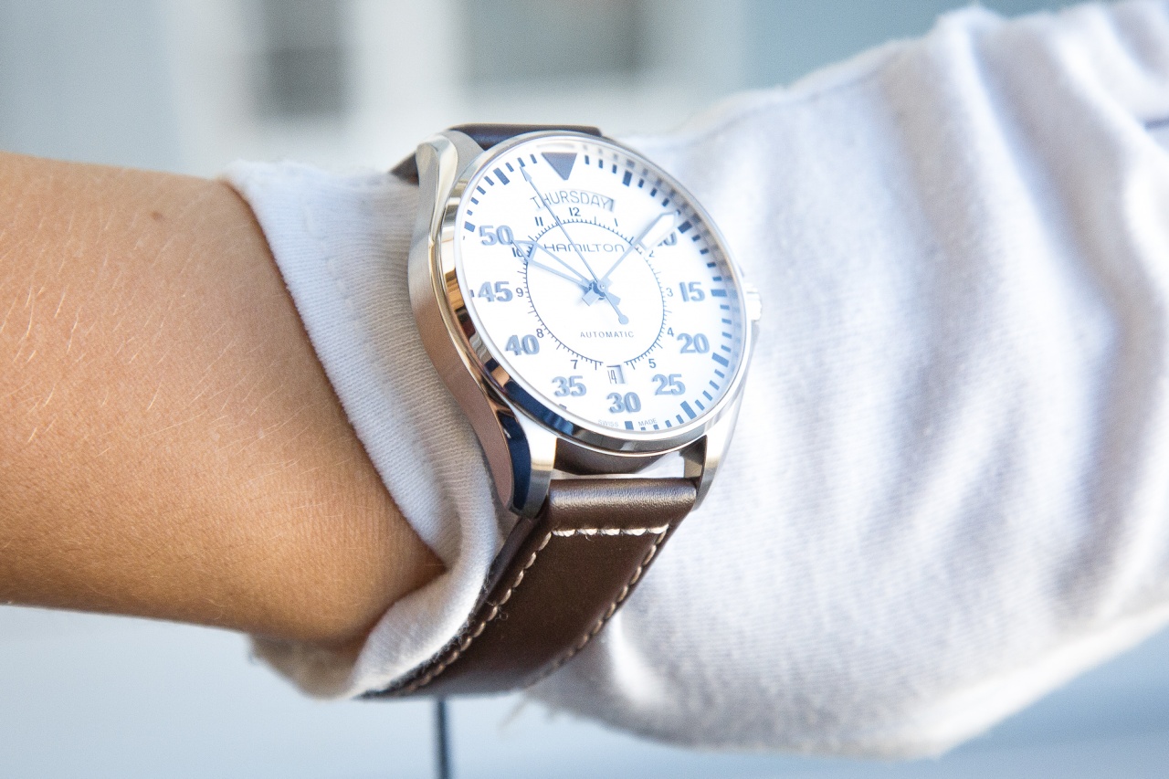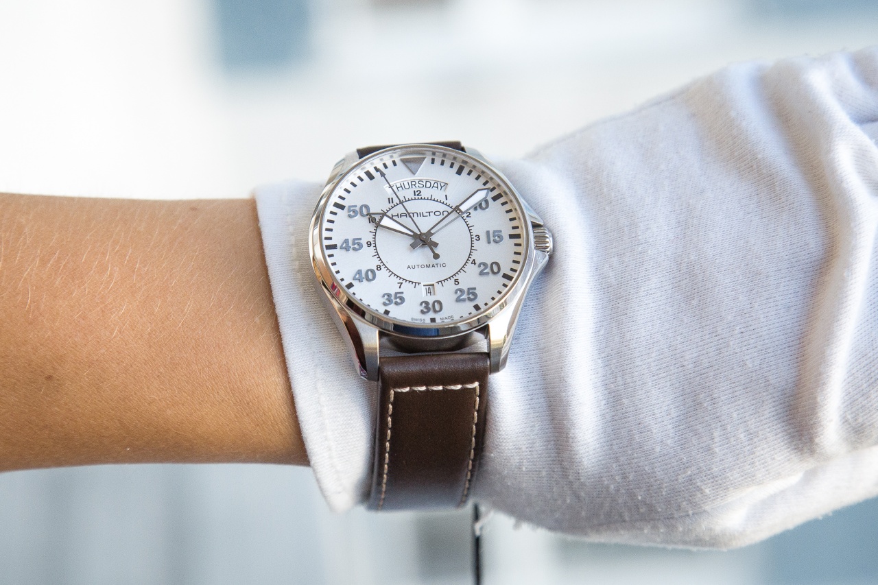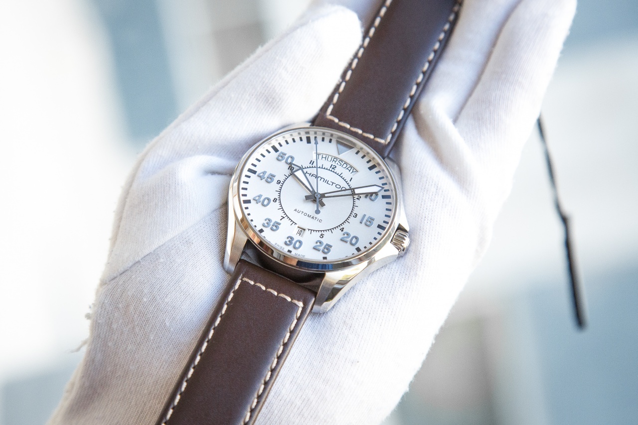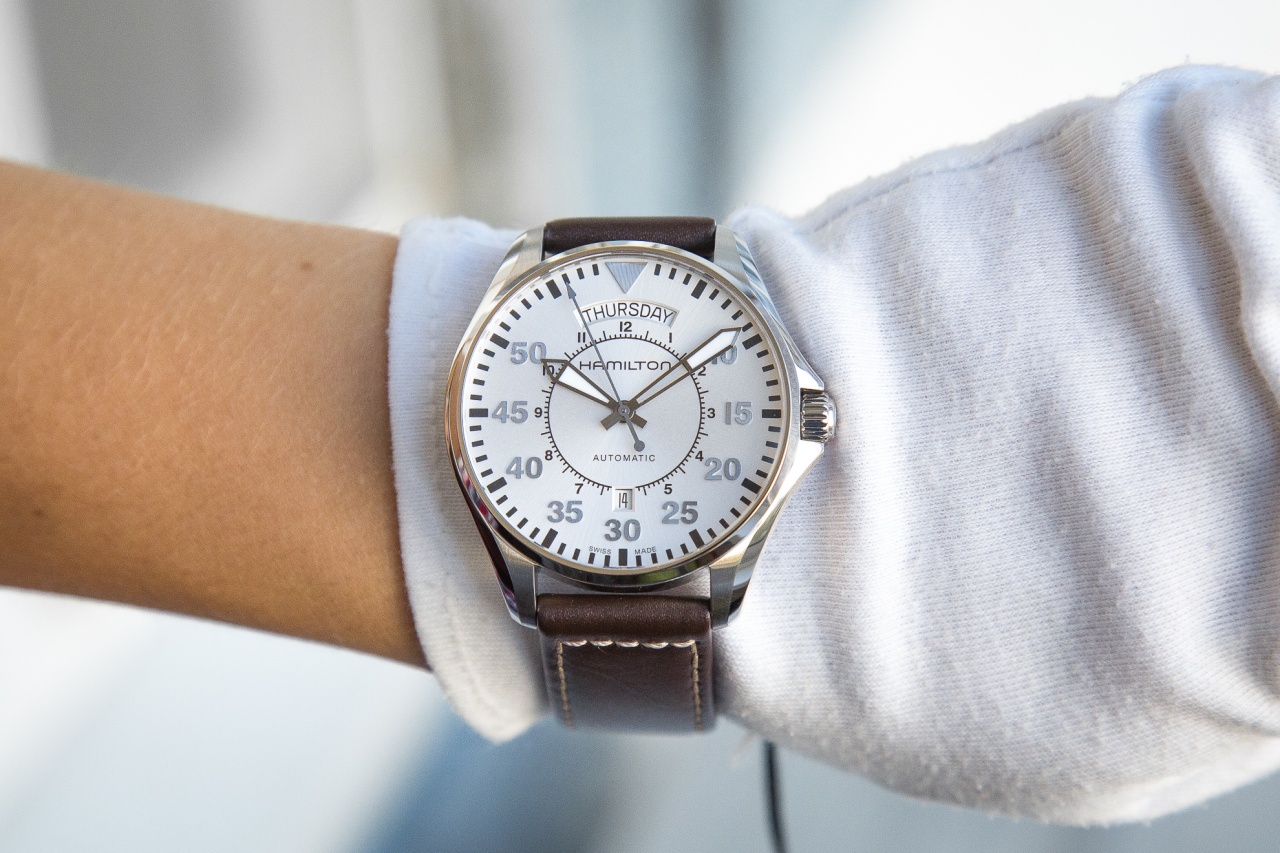 Khaki Pilot с их классическим дизайном пилотских часов позволяют обладателю ощутить себя одним из пионеров американской авиации. Характерными особенностями этих часов являются крупный, удобочитаемый циферблат, индикация даты и дня и люминесцентное покрытие Superluminova на стрелках. По форме и набору функций Khaki Pilot - предмет первой необходимости для авиаторов.