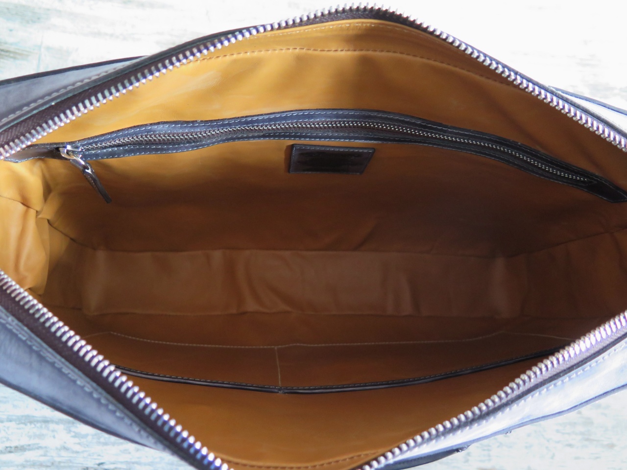 Внутренняя часть сумки изготовлена из кожи тёмно-бежевого цвета, и имеет одно большое отделение для переноски ноутбука, документов и прочих вещей, дополнительное отделение на молнии для хранения сотового телефона, бумажника, паспорта и прочих документов, и два дополнительных отделения. К сумке прилагается регулируемый плечевой ремень из кожи тёмно-серого цвета с карабинами из никеля.