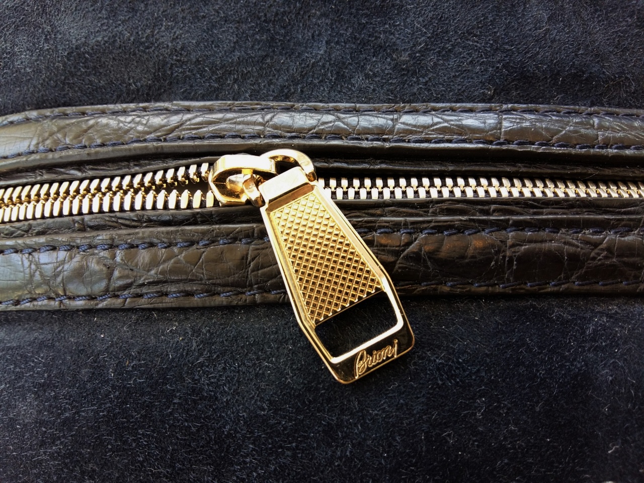 Сумка изготовлена из 100% замши и кожи миссисипского аллигатора высочайшего качества выделки, окрашенной вручную в тёмно-синий цвет.