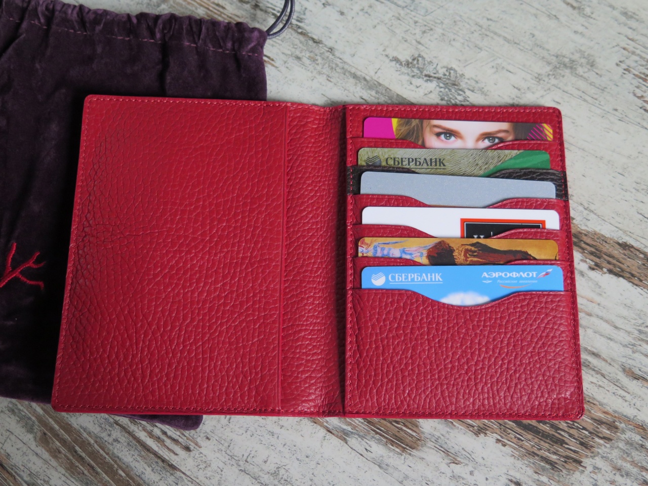 Внутри обложка имеет отделение для паспорта, которое отделано внутри шёлковой тканью красного цвета с логотипами марки "ISAIA" и шесть отделений для кредитных карт или визиток, одно из которых выполнено из кожи контрастного, коричневого цвета.