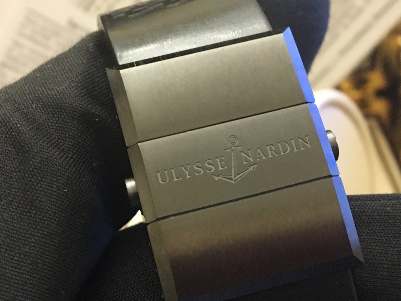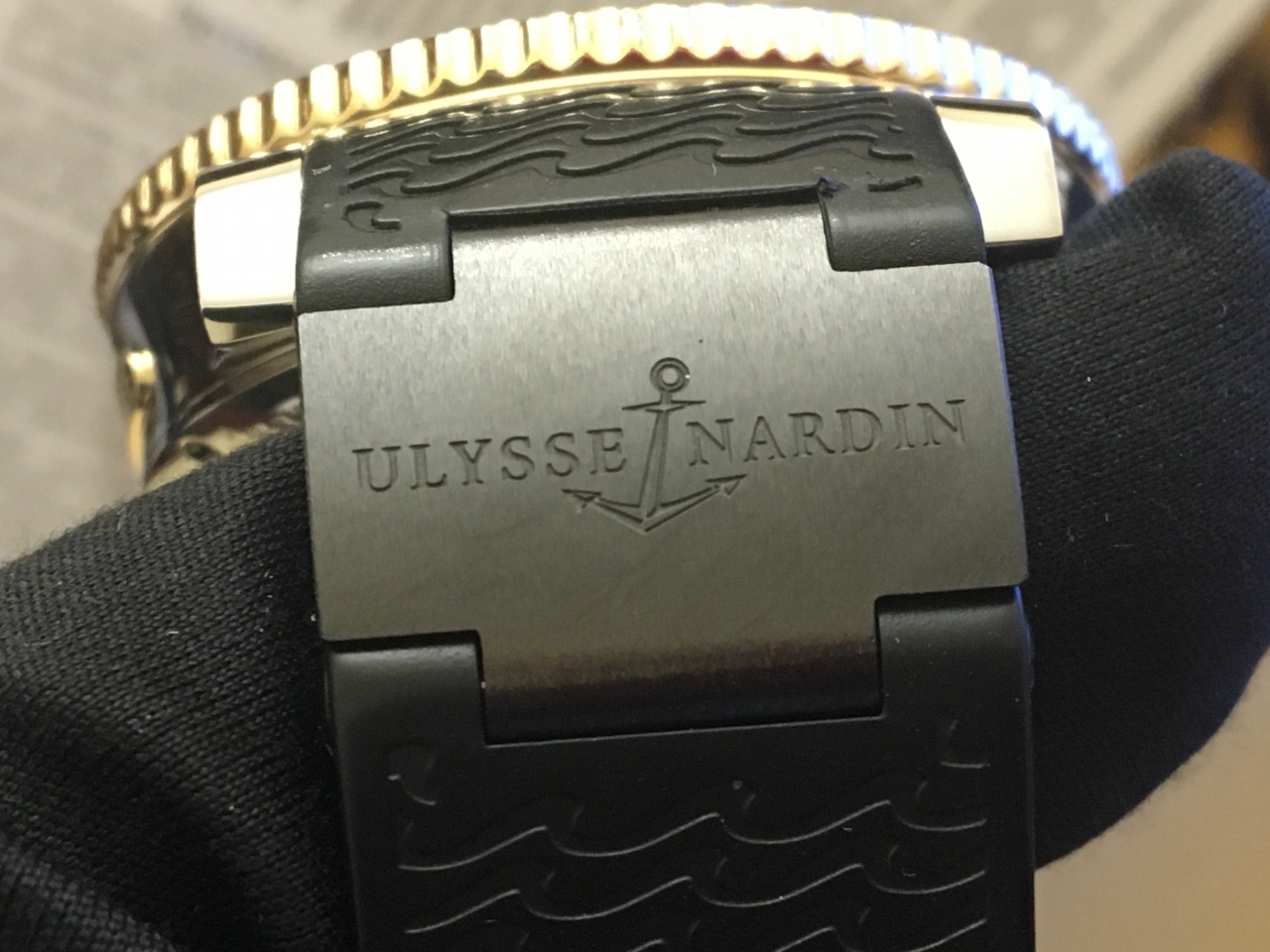 Модель выполнена в исполнении 3 материалов корпуса: стали, титана и розового золота 18 карат. Заводная головка так же выполнена из розового золота с каучуковыми вставками для большего удобства при заводе часов. Циферблат с классическими черными волнами, метки и стрелки золотые покрыты люминесцентным составом для лучшей видимости под водой и в темное время суток. Часы с автоподзаводом, калибр UN-26 на 28 камнях, 28800 полуколебаний в час и запасом хода в 42 часа. Окошко даты в положении на 6 часов с маленькой секундной стрелкой. Индикатор запаса хода в положении на 12 часов. Ремешок выполнен из черного каучука с черными керамическими вставками, одна из них с фирменной надписью Ulysse Nardin и раскладной застежкой из титана и стали с PVD покрытием.