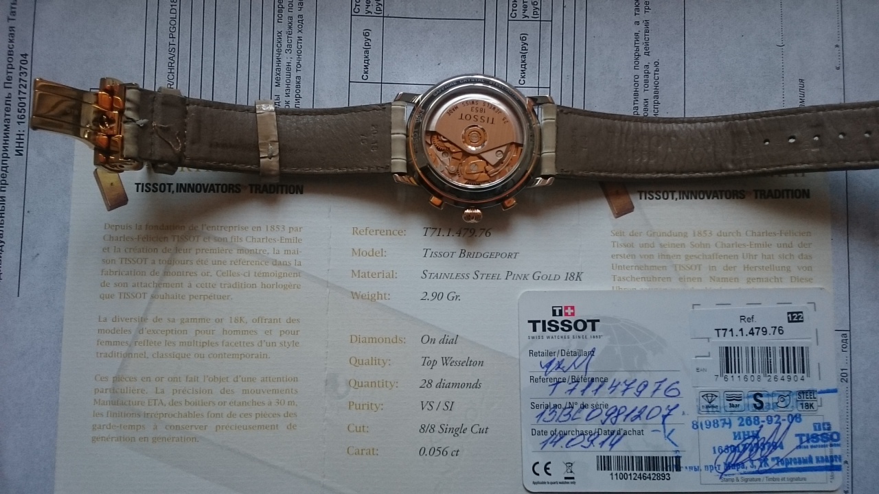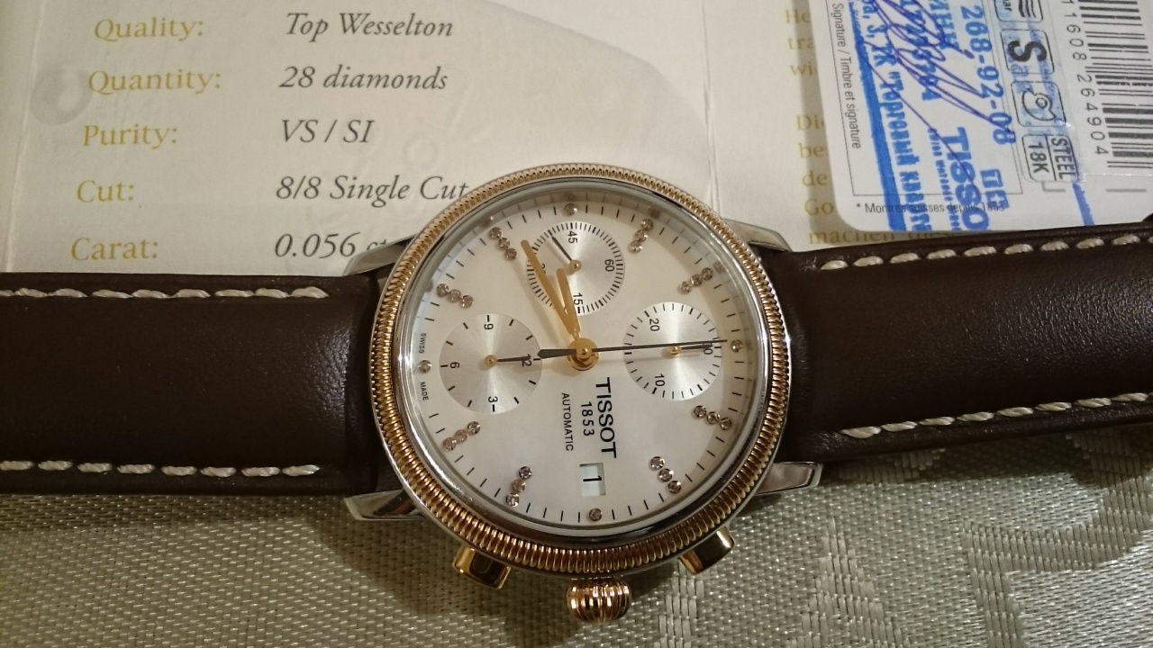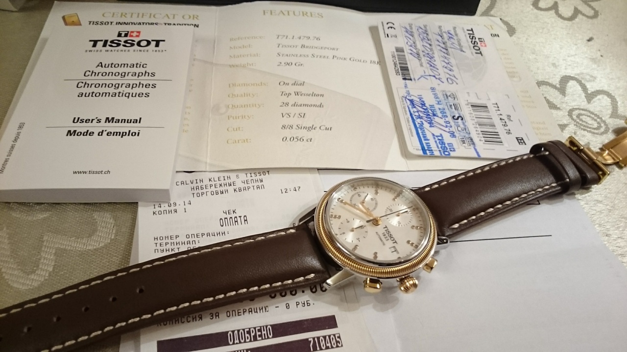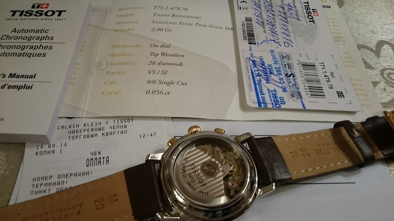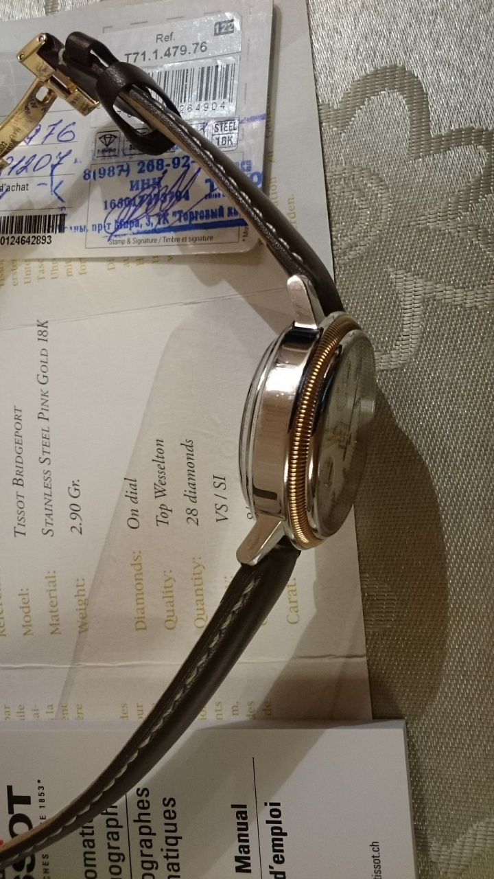 Комплектация полная; коробка, инструкции, гарантийная карточка, сертификат на безель и бриллианты, и даже чек о покупке.