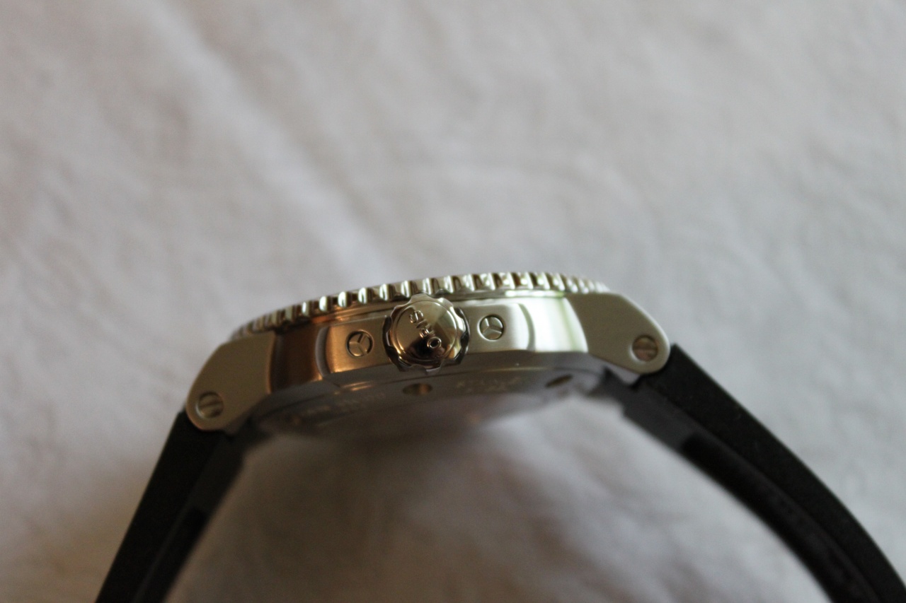 Чёрный каучуковый ремешок, раскладывающаяся застежка из нержавеющей стали с дополнительным фиксатором и удлинением.