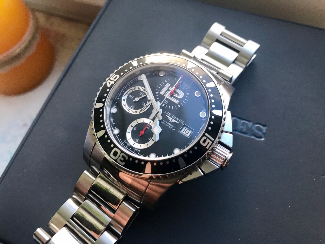 Классный и очень стильный механический хронограф от именитой марки Longines. На мой взгляд, самая удачная модель из серии Hydroconquest. Великолепный дизайн с яркими нотами спорта, и, в то же время, отличная универсальность в плане сочетаемости с одеждой (подойдёт как под костюм, так и под футболку). "Под капотом" самый надёжный и проверенный временем Valjoux 7750. Водозащита 300 метров (плавание, ныряние - без проблем). Диаметр 41мм - прекрасно и органично сядут на любого размера запястье.