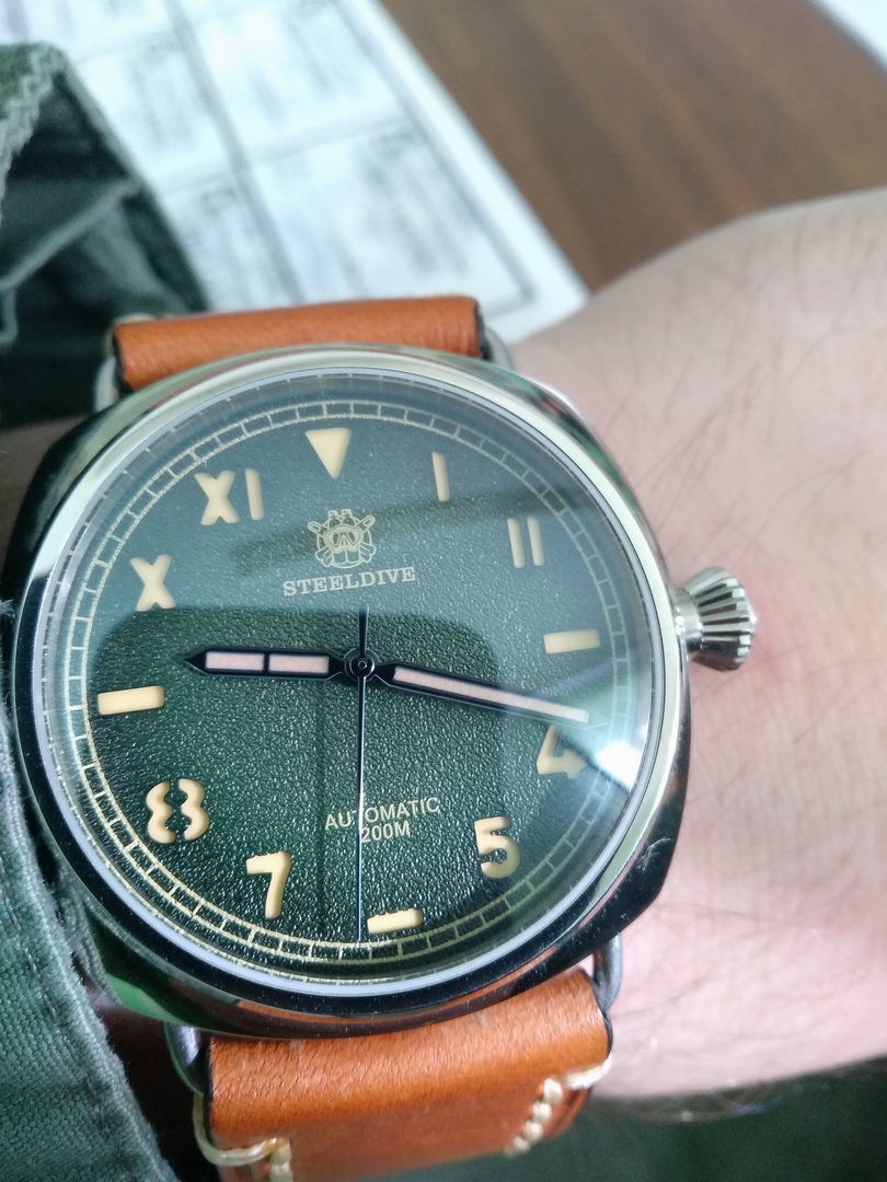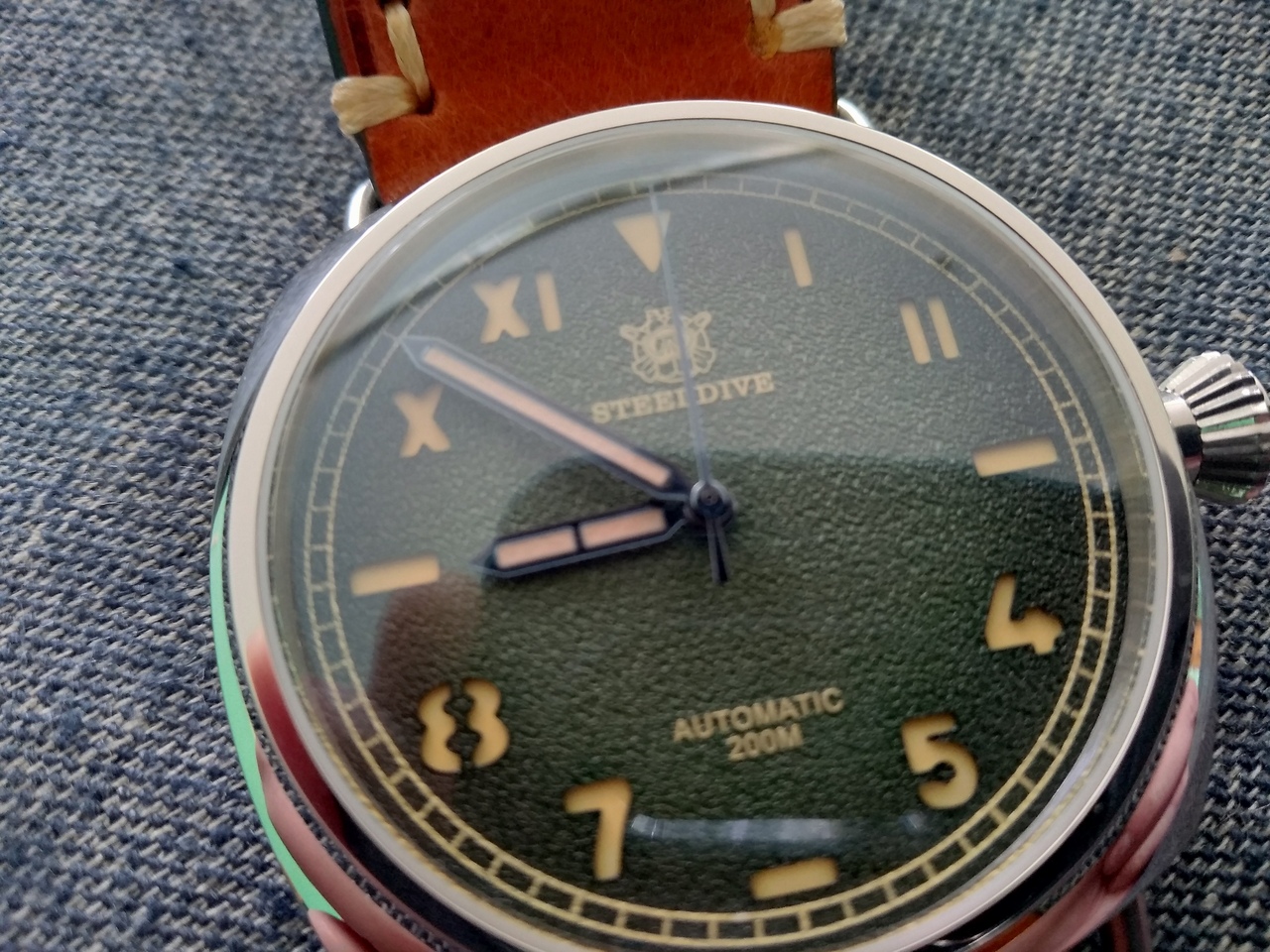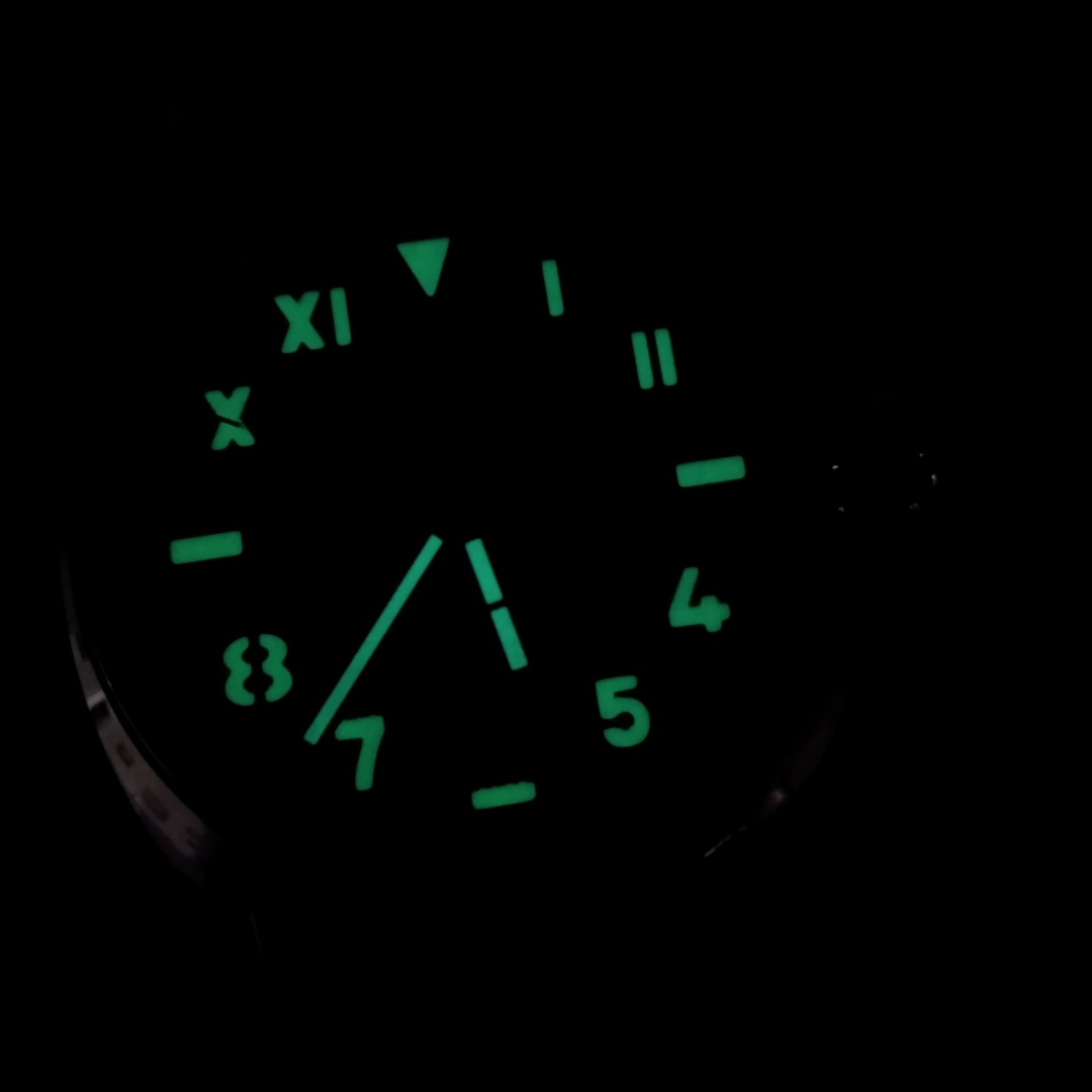Циферблат - приятного зеленого цвета, фактурный, и выполнен в виде сендвича. Смотрится классно. Люминофор на стрелках и метках - мое почтение, светит ярко, а главное долго.