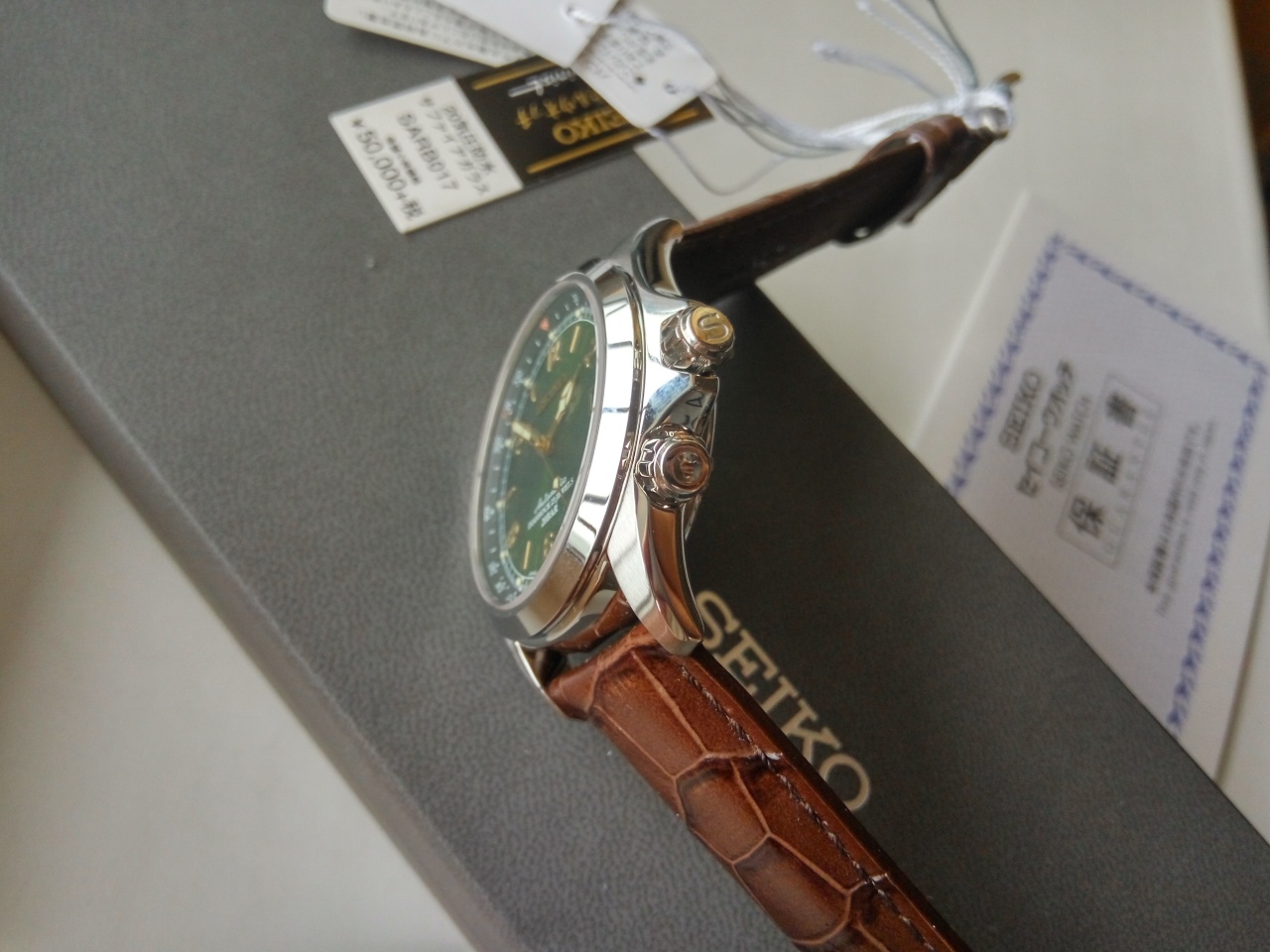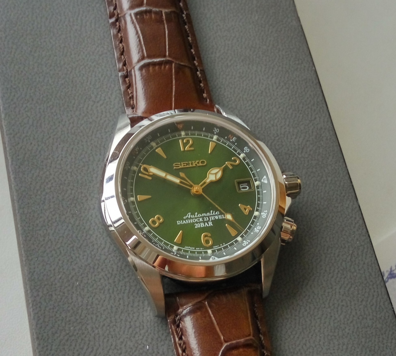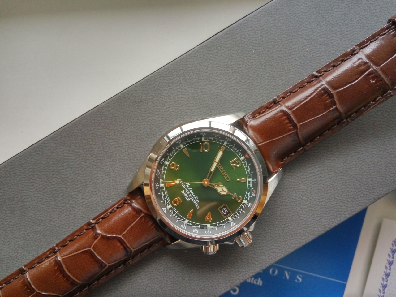 В продаже знаменитые зеленые Seiko Альпинист sarb 017. Данные часы сделаны для внутреннего рынка Японии - JDM, поэтому качество отделки безупречное для данной ценовой категории. Потрясающий зеленый циферблат и отличный надежный механизм уже давно сделали эти часы настоящей легендой. Часы совершенно новые, соответственно все документы и коробки присутствуют.