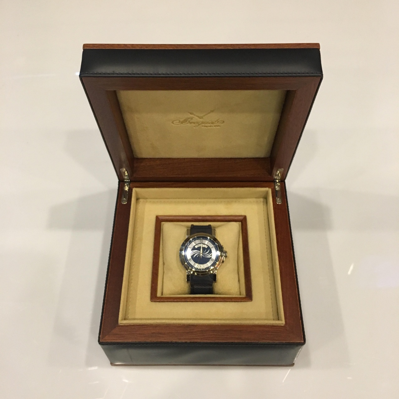 Часы Breguet Marine Big Date 5817ST/Y2/5V8 представлены в корпусе из нержавеющей стали диаметром 39 мм и высотой 12 мм. На стальные стрелки, выполненные в стиле Бреге, нанесено люминесцентное покрытие, благодаря которому легко определять время в темноте. Кроме того часы украшает синий циферблат из посеребренного 18-каратного золота с гильошированным вручную узором. Часы и минуты отображаются при помощи римских цифр. В позиции 6 часов находится окошко большой даты. Модель Breguet Marine Big Date дополнена каучуковым ремешком синего цвета со стальной откидной застежкой. Водонепроницаемость корпуса составляет 100 метров. Завода часов Breguet Marine 5817 хватает на 65 часов. За работой автоматического Калибра Breguet 517GG можно наблюдать через прозрачную заднюю крышку. Часы представлены в элегантной фирменной коробке из дорогих пород дерева.