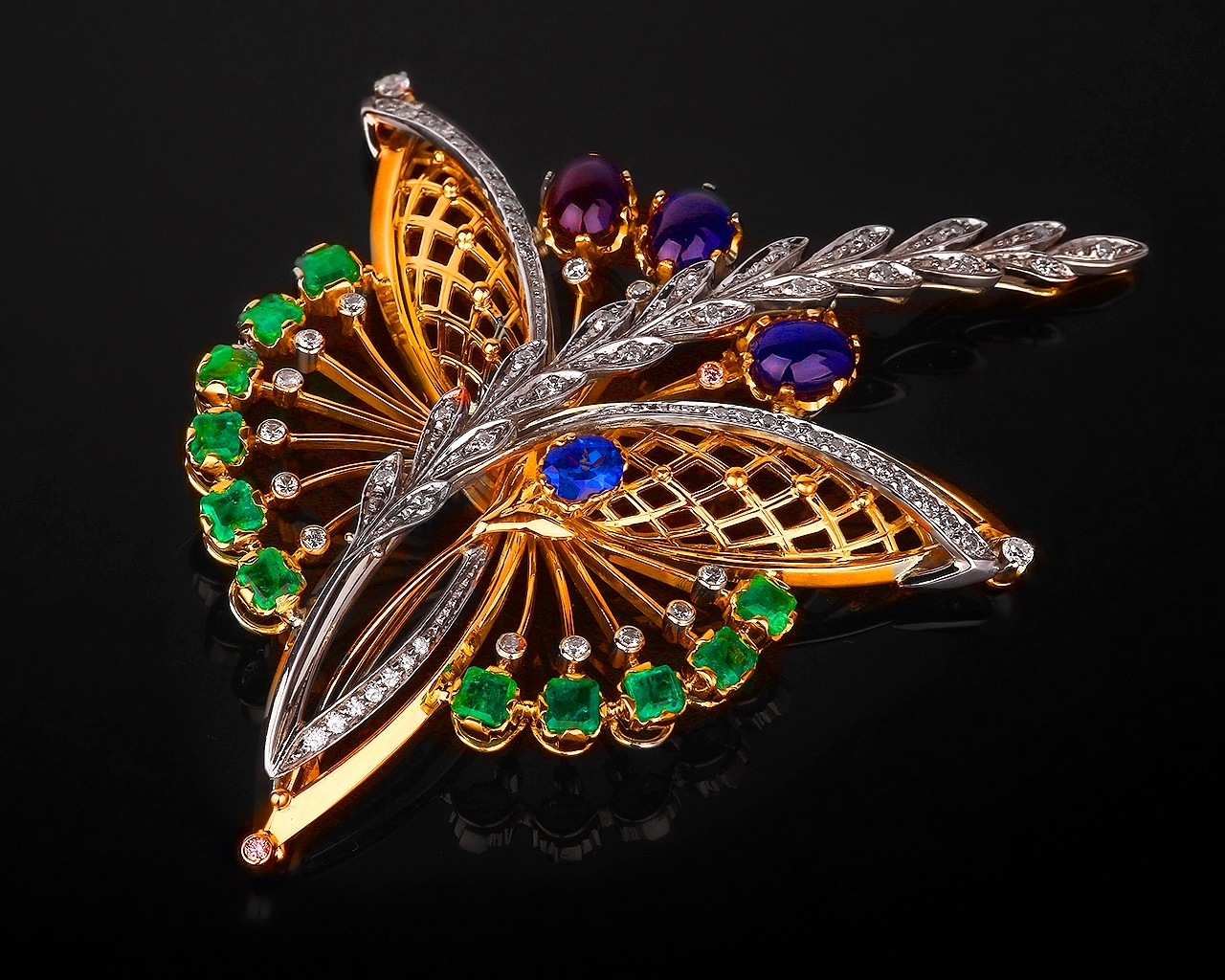 Бриллиантовая брошь с сапфирами и изумрудами