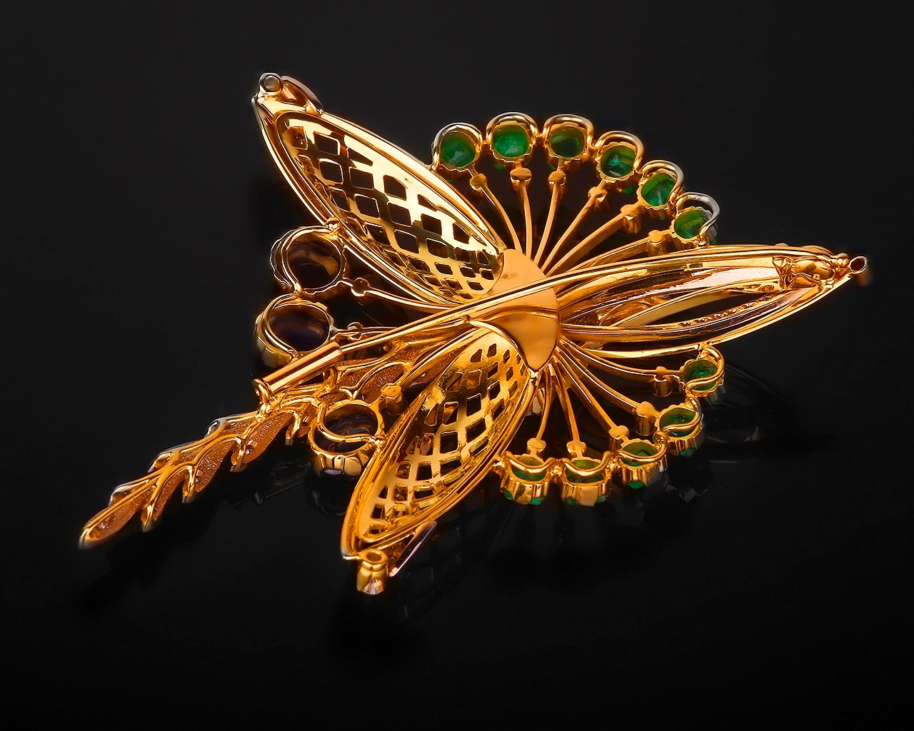 брошь с сапфирами и изумрудами, золотая брошь |