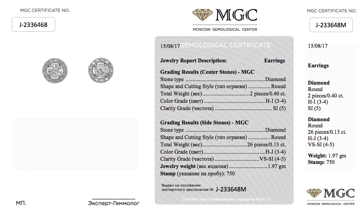 Серьги-пуссеты из белого золота с бриллиантами 0,53 карат (сертификат МГЦ)