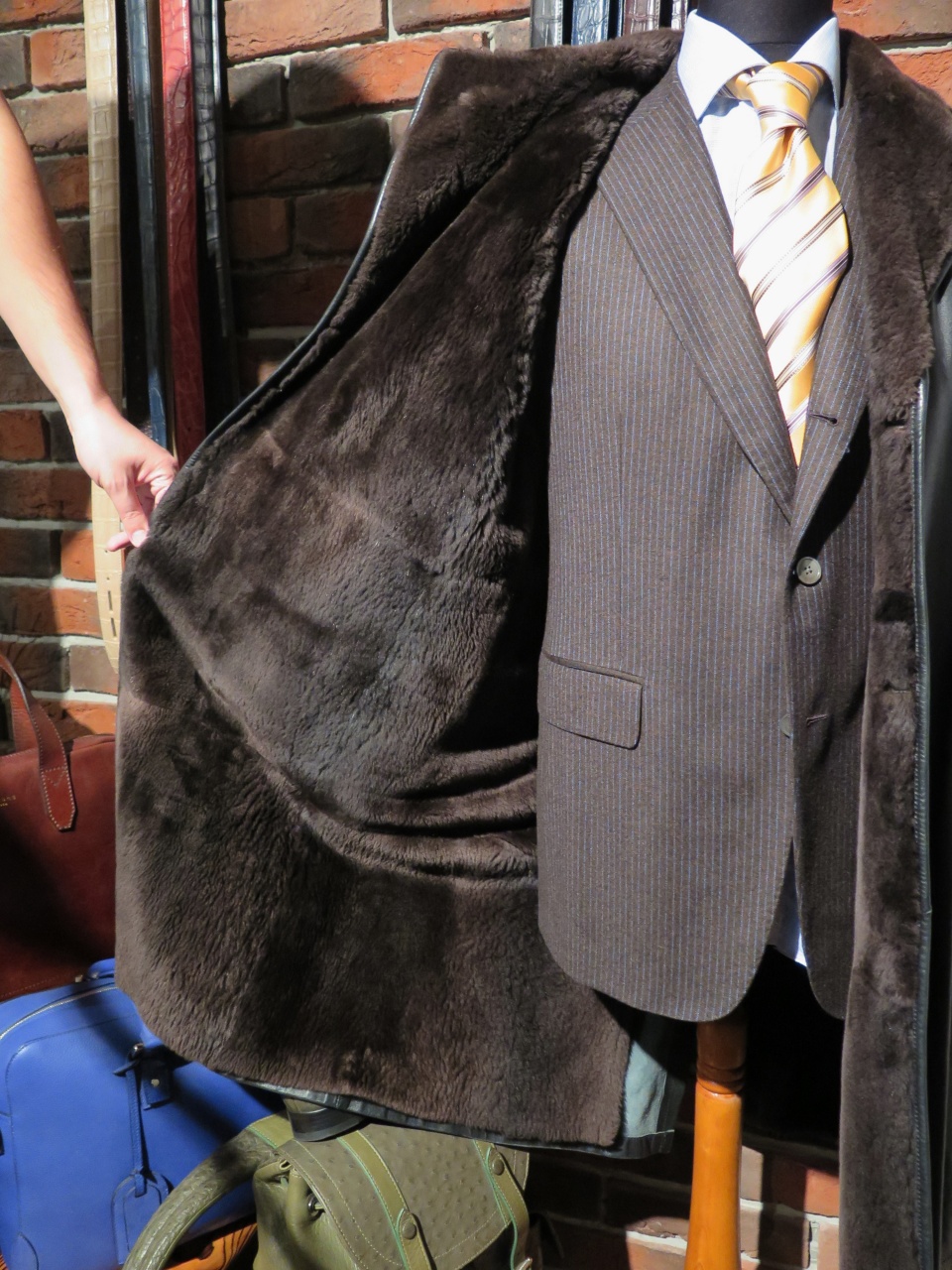 Воротник и сплошная подкладка пальто изготовлена из 100% меха стриженного бобра.