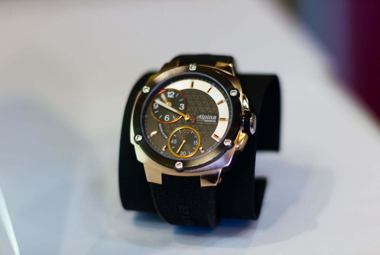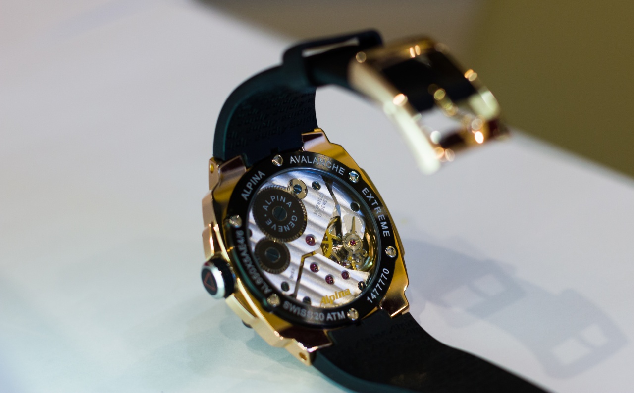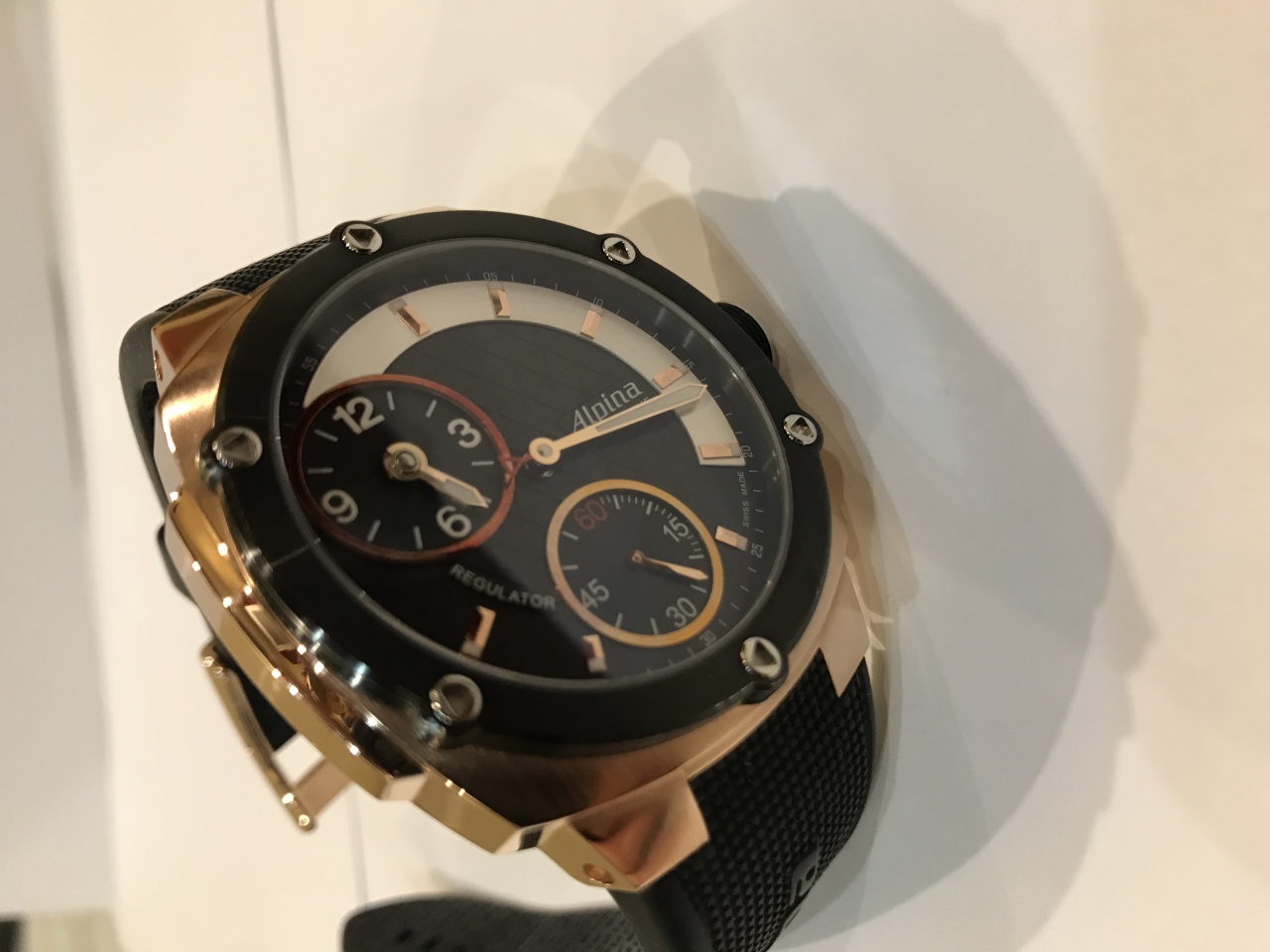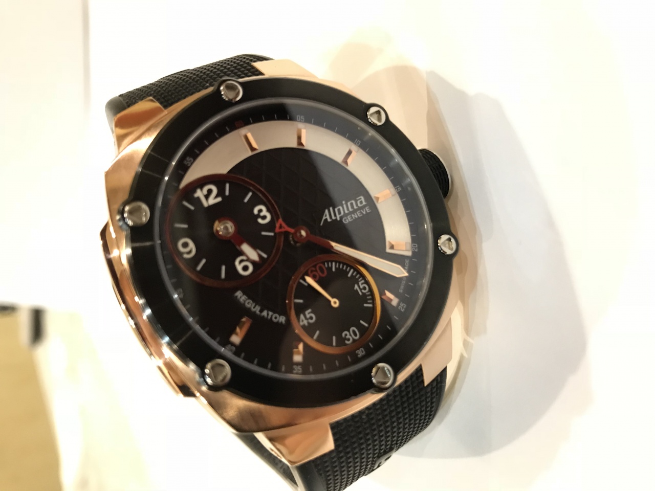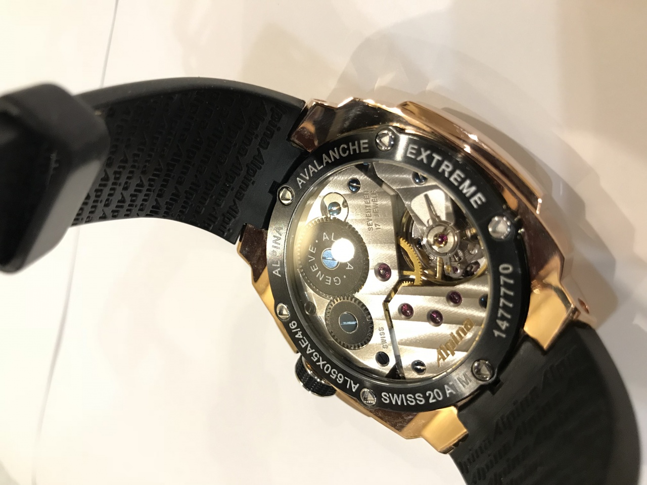МОДЕЛЬ: AL-650LBBB5AE4 КОРПУС: нержавеющая сталь, покрытие PVD "розовое золото". Размер 48 мм. Толщина 12 мм. Прозрачная задняя крышка. Закручивающаяся заводная головка. МЕХАНИЗМ: Швейцарская механика AL-650. 17 рубиновых камня. Запас хода на 42 часа. ЦИФЕРБЛАТ: черный текстурированный с белым сектором.Центральная стрелка указывает минуты. Малый циферблат у цифры 10 указывает часы. Малый циферблат у цифры 6 указывает секунды Окно даты у цифры 3.Стрелки, цифры и часовая разметка люминесцентные СТЕКЛО: сапфировый хрусталь,защищенный от царапин, с антирефлекторным покрытием. БРАСЛЕТ: каучуковый черный ремешок, ALPINA logo на застежке. Максимальная длина 23.5 см. ВОДОНЕПРОНИЦАЕМОСТЬ: 200 метров