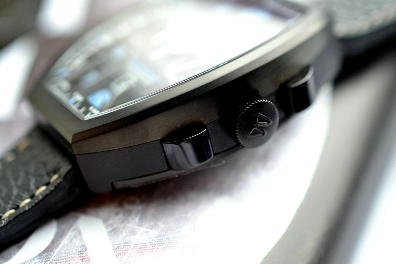 Корпус часов состоит из трех частей: задняя крышка и верхняя часть из титана, средняя часть корпуса из авиационного алюминия. Весь корпус покрыт черным PVD, благодаря алюминию и титану часы просто невесомы, при этом обладают низкой теплопроводностью и всегда теплые. Размер корпуса - 50х39мм, высотой 14 мм.