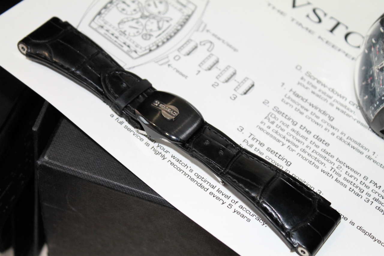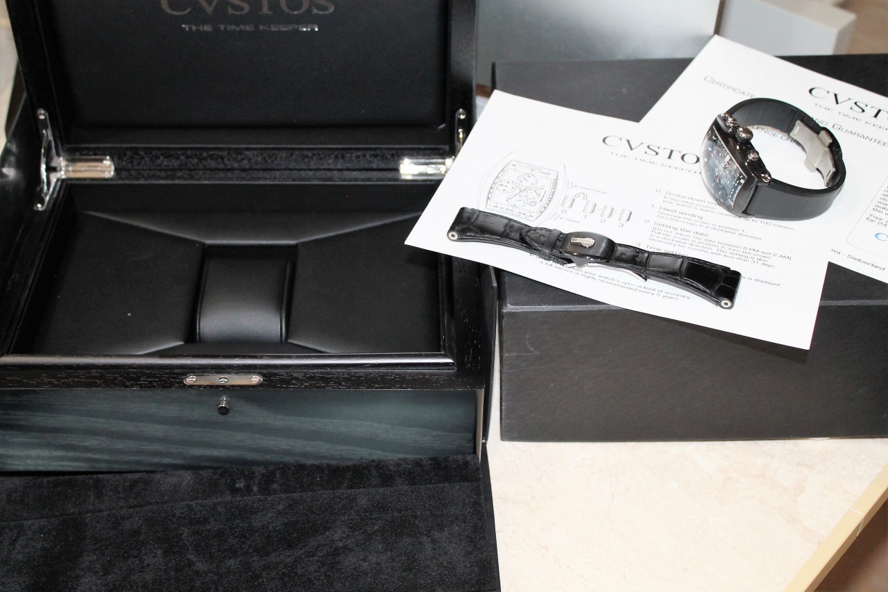 Комплект: коробка картонная наружная, внутренняя очень красивая из "шикарного" дерева, обернута фирменной бархоткой-тряпочкой с тиснением серебром с названием бренда, собственно сами часы, два сертификата один из которых с печатью, сейчас часы на оригинальном свежем каучуке(в идеальном состоянии) на большую руку, каучук пахнет "ванилькой" + оригинальный аллигатор в практически новом состоянии. Прошу обратить внимание что оба ремня со своими родными оригинальными застежками(цена одних только ремней с застежками почти треть цены того, что я прошу за часы, кто сталкивался с покупкой данных аксессуаров тот меня отлично поймет).