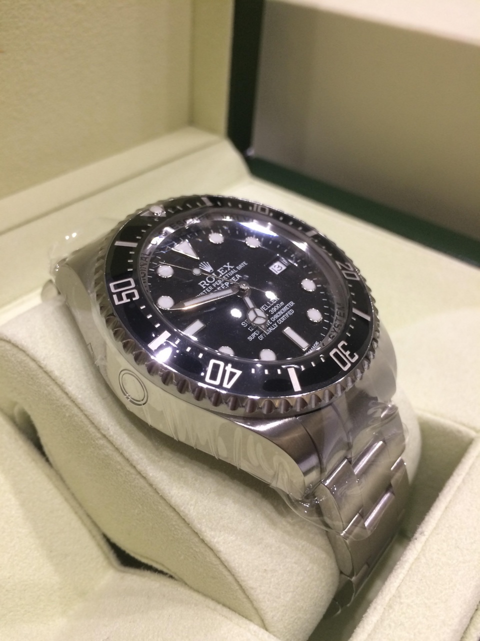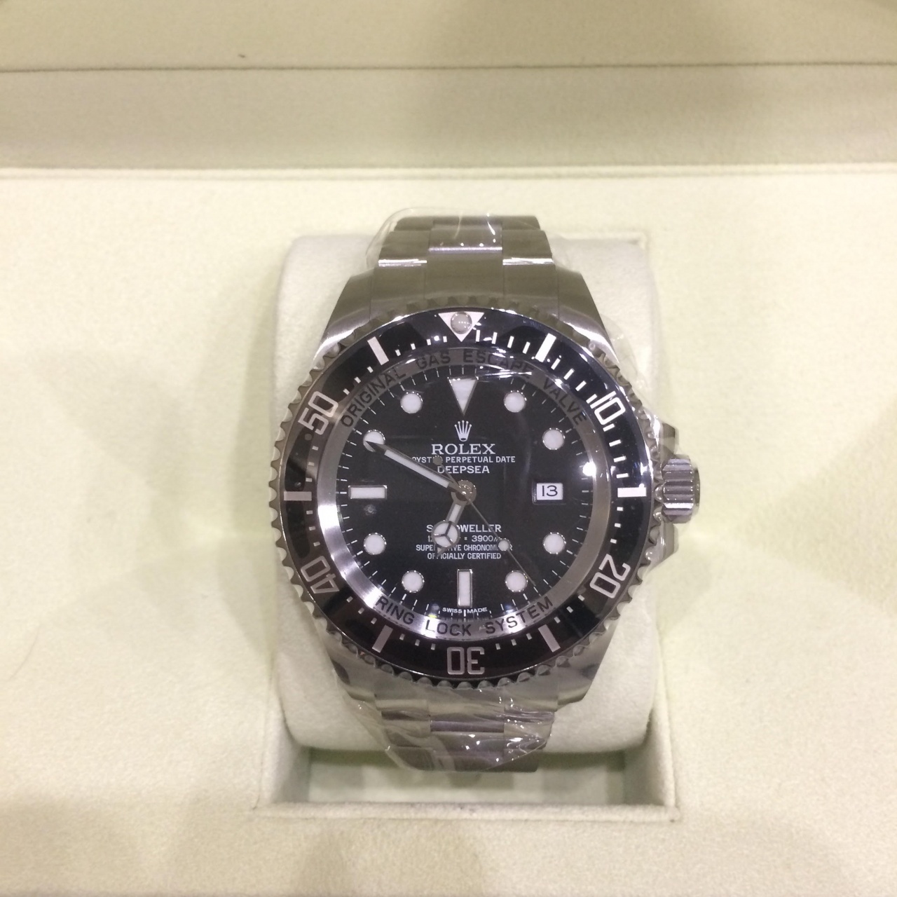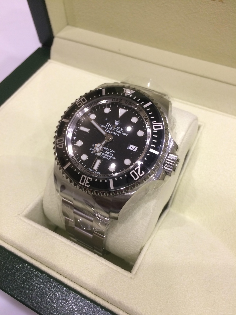 Великолепные дайверские часы Rolex DeepSea ref. 116660 обладают поразительной характеристикой: модель водонепроницаема на глубине 3900 метров(!). 44-миллиметровый корпус часов Rolex DeepSea и браслет выполнены из нержавеющей стали. Часы оснащены гелиевым клапаном, который выпускает скопившийся за время нахождения дайвера в декомпрессионной камере гелий, защищая часы от последствия разности давлений внутри корпуса и снаружи, не нарушая водонепроницаемости часов.