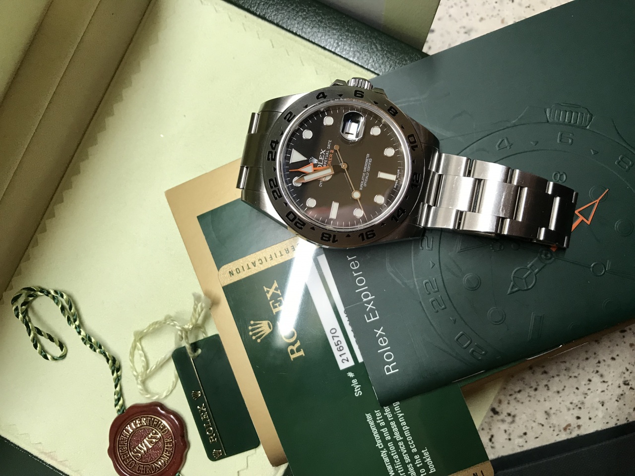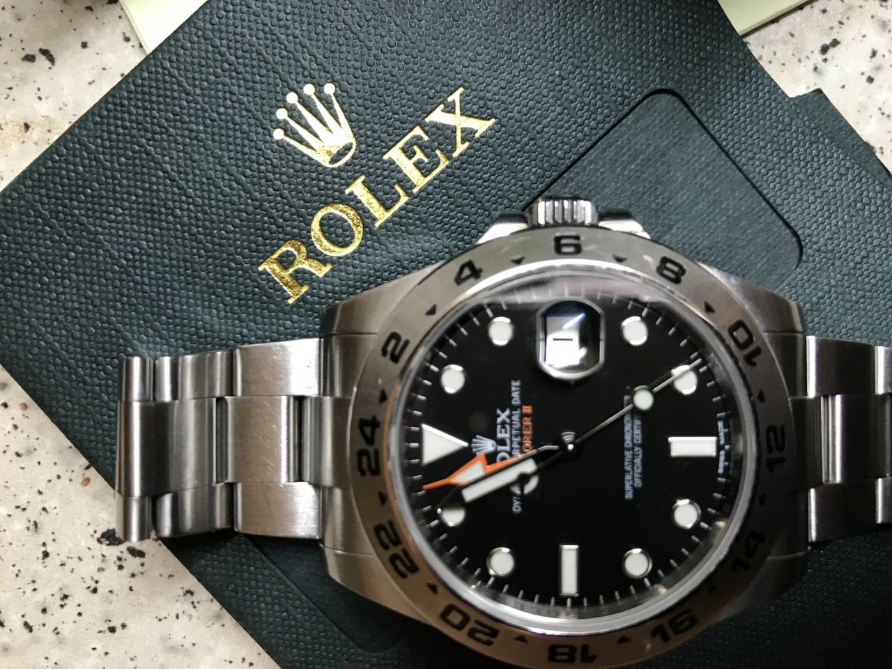 Всем доброго времени суток. Уважаемые форумчане предлагаю Вашему вниманию Rolex explorer II 42мм, 2013 года выпуска, чёрный циферблат, на полном комплекте (карточка, документы, пломбы, салфетка, коробки и т.д.), Часы не полировались и не обслуживались. Готов обменять на Rolex submariner ceramic date 116610LN с моей доплатой. Жду Ваши преложения.