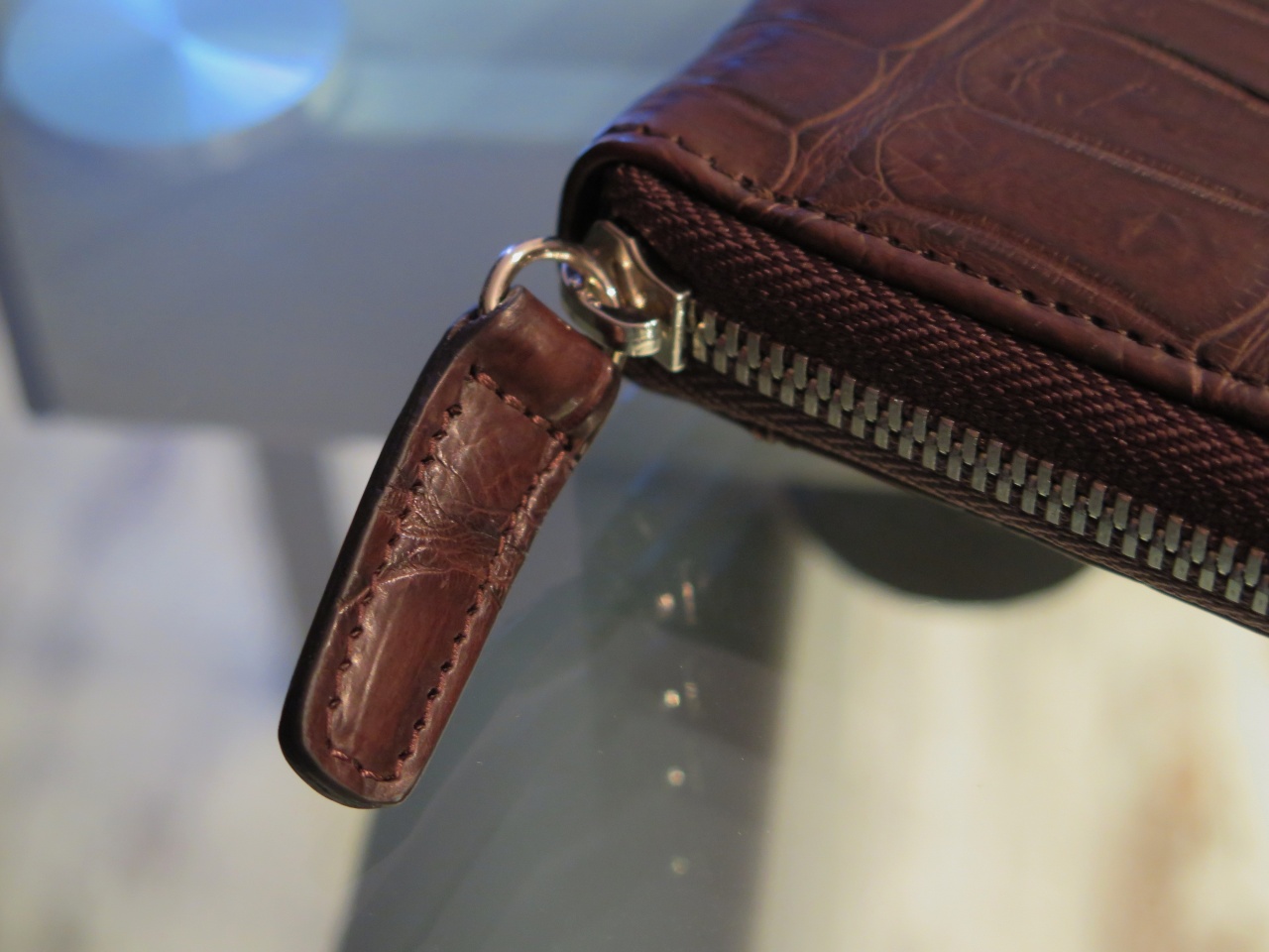 Внутри клатч отделан телячьей кожей коричневого цвета, некоторые элементы внутри отделаны из кожи аллигатора (бегунки молний, клапан на кнопке)