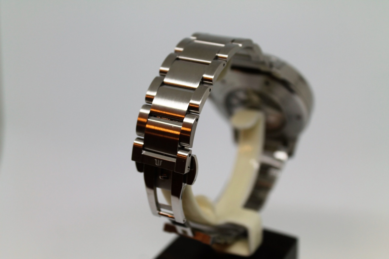 • Механизм с автопозаводом, калибр ML112 - персонализированный, на базе ETA Valjoux 7750. • Запас хода 48 часов, частота колебаний баланса 28 800 пк/час, 25 камней. • Хронограф с центральной секундной стрелкой, 12-часовым и 30-минутным и индикаторами на «6» и «12 часах» соответственно. • Центральные часовая и минутная стрелки. Дата на отметке «6 часов». • Корпус из нержавеющей стали 316L с чередующимися матовыми (сатинирование) и полированными до зеркального блеска поверхностями. • Диаметр корпуса 43 мм, толщина - 16 мм. Расстояние между дужками 21 мм. • Выпуклое сапфировое стекло с двухсторонним антибликовым покрытием • Циферблат с матовой зернистой шлифовкой. Накладные индексы, логотип марки и стрелки отполированы до алмазного блеска и имеют покрытие родием или розовым золотом. Окантовка счетчиков в виде аппликации с сатинированной поверхностью. • Люминесцентное покрытие Superluminova на разметке циферблата и стрелках. • Задняя крышка с прозрачным окном из сапфирового стекла соединяется с корпусом 5 винтами. • Водостойкость на глубине до 50 метров (5 атм). • Браслет с литыми звеньями из нержавеющей стали. Раскладывающаяся застежка с кнопками, открывающаяся при одном нажатии.