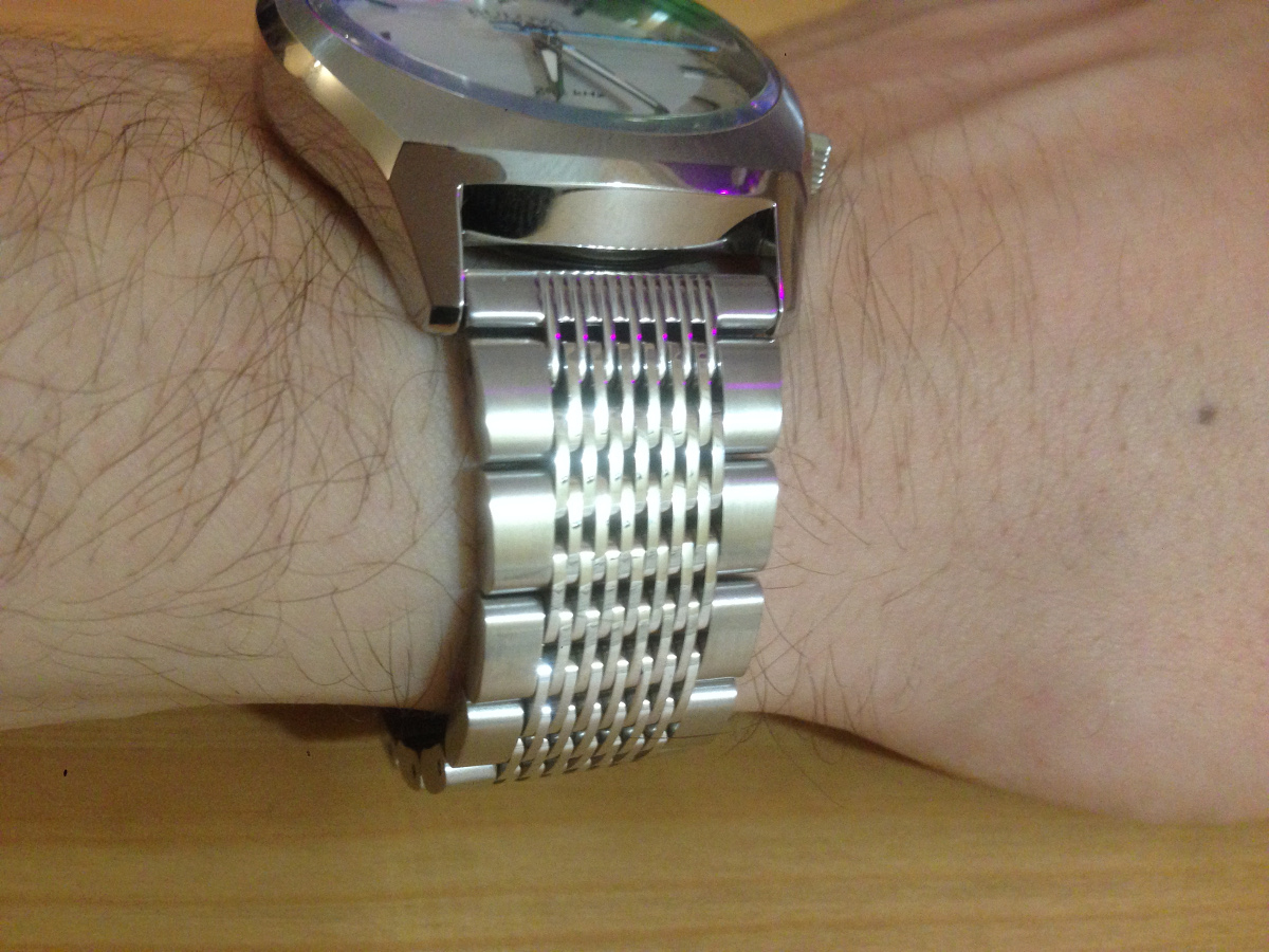 Браслет фирмы Geckota, модель Tapered Solid Mesh - внешне что-то среднее между литым браслетом и плетёным. Заказывал на офсайте watchgecko.com.