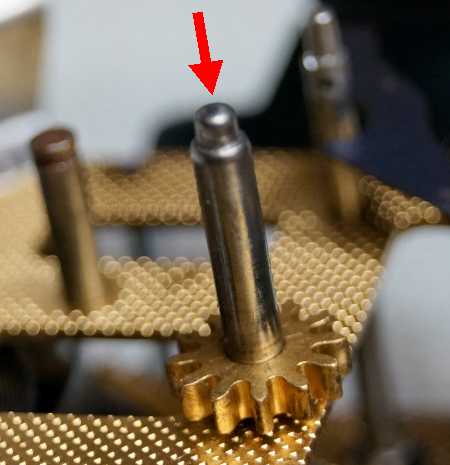 после разборки механизма, когда в руках останется только передняя платина с упомянутым валом, удерживая платину просто в руке над столом, чтобы ось вертикально висела на шестеренке, легонько стукнуть-тюкнуть часовым молоточком по этому сферическому торцу,