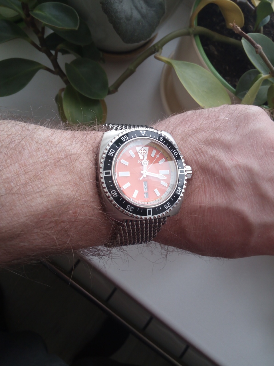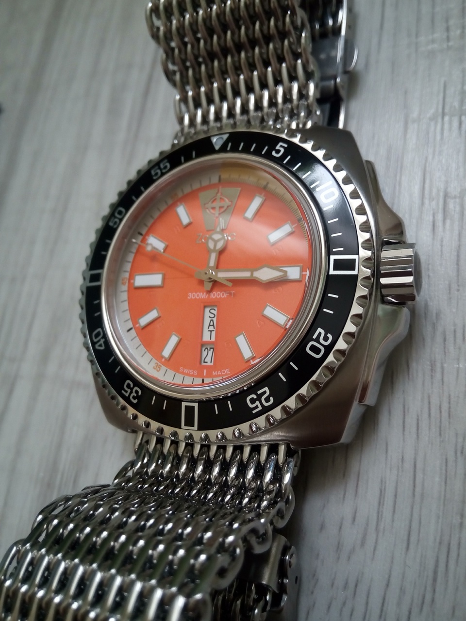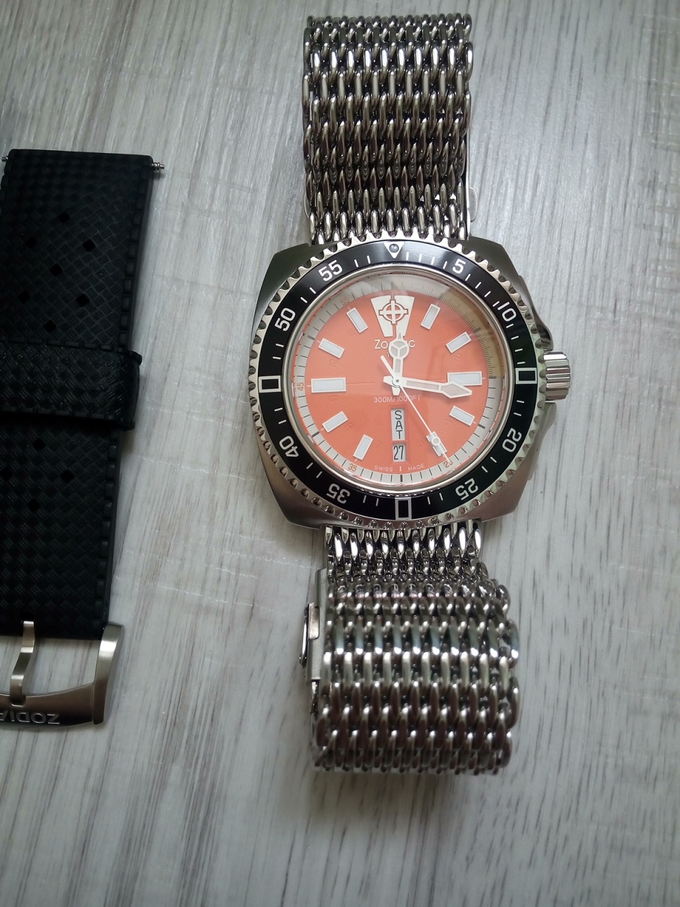 Продам Zodiac V-Wolf. Часы в хорошем состоянии, что редкость для этой модели, обычно их активно носят. Модель учень удобная, хорошо лежит на руке за счет отсутствия ушек. Стекло чистое, безель без царапин, по корпусу минимальные следы использования, в основном на задней крышке. Часы продаются на меш-браслете (ок.18см), в комплекте родной тропик-каучук ремень, почти не использовался, как новый.