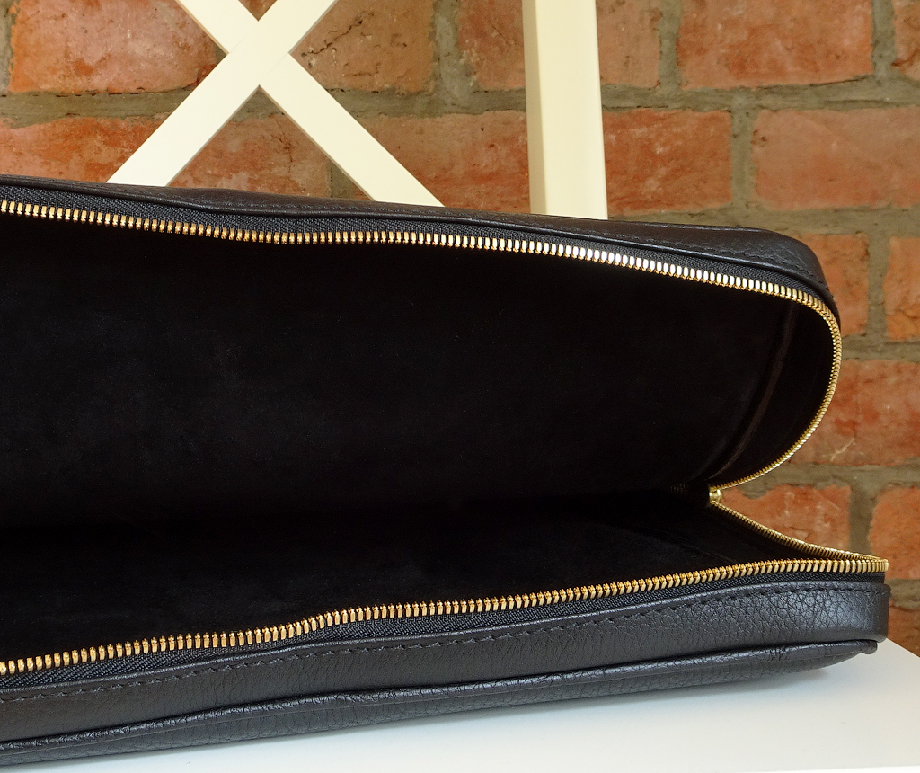 Внутри одно отделение с подкладкой из плотной натуральной черной замши, без каких-либо отсеков и карманов.